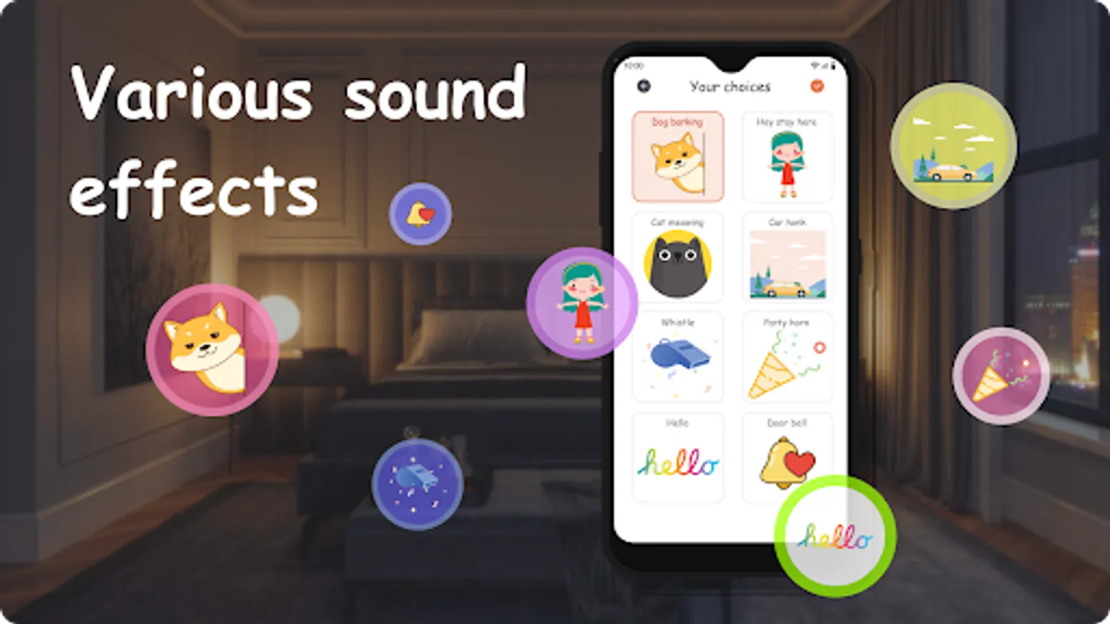 👏 Customizable sound: You can set your preferred sound pattern, allowing you to choose from a range of response sounds like: dog, cat, party....