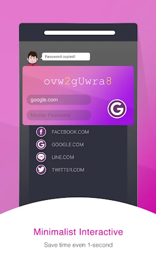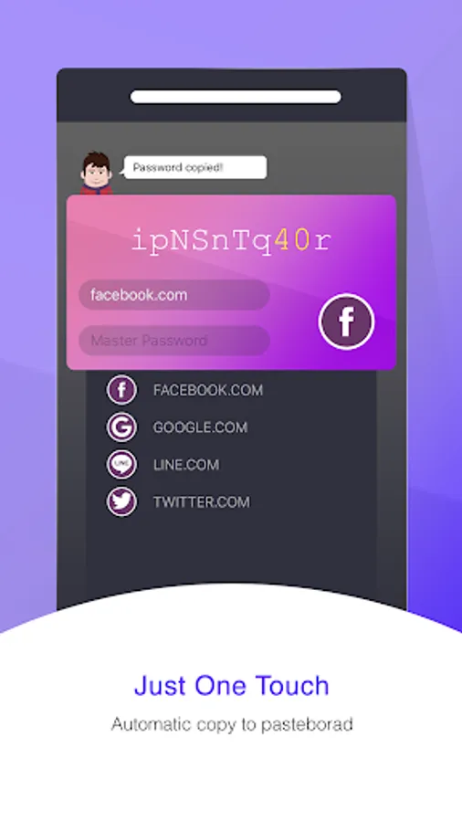 Generate secure, per-domain password based on an original master password, with the click of a button.