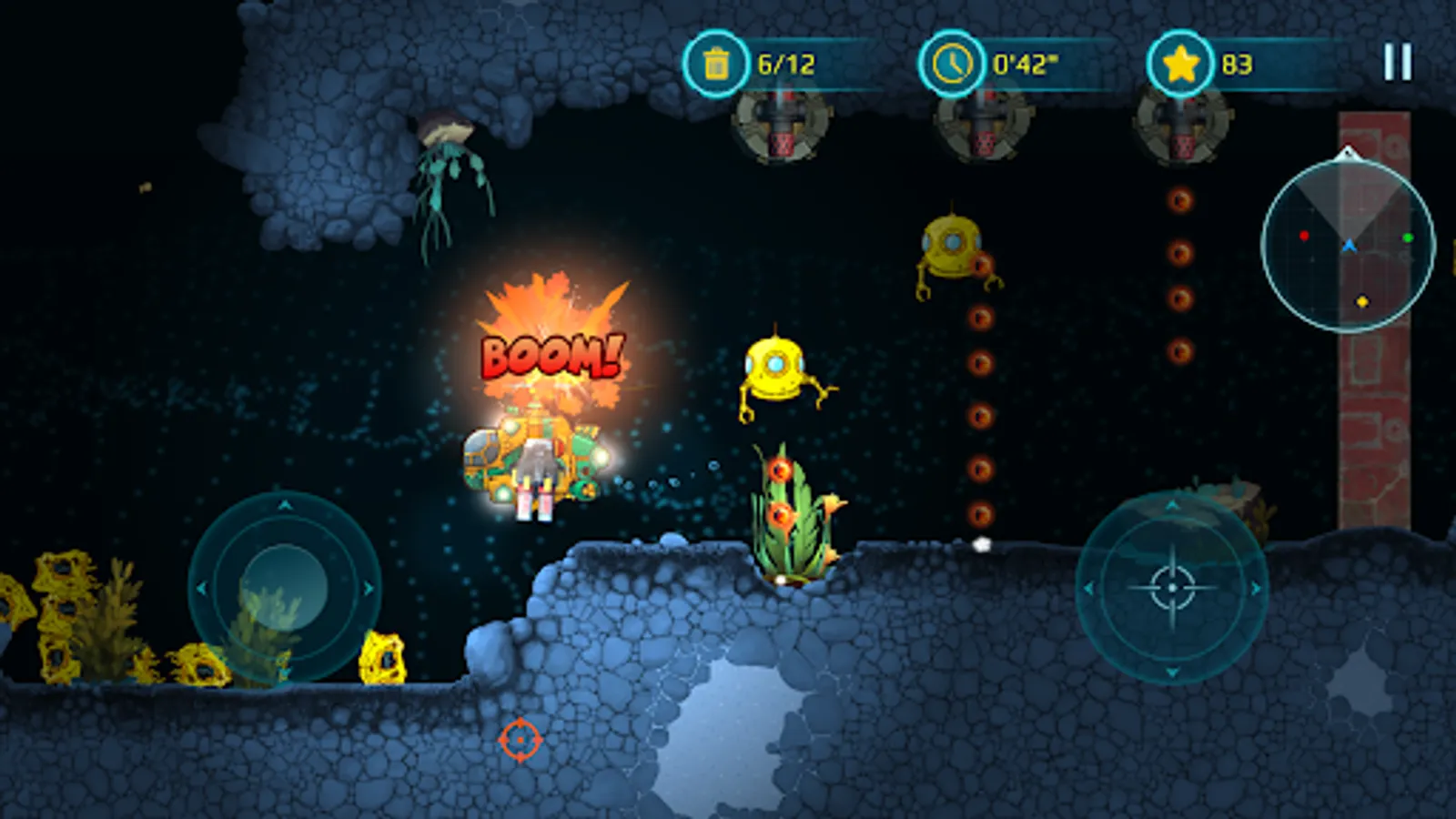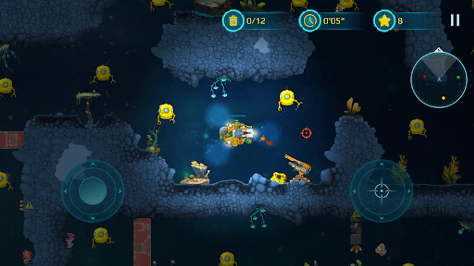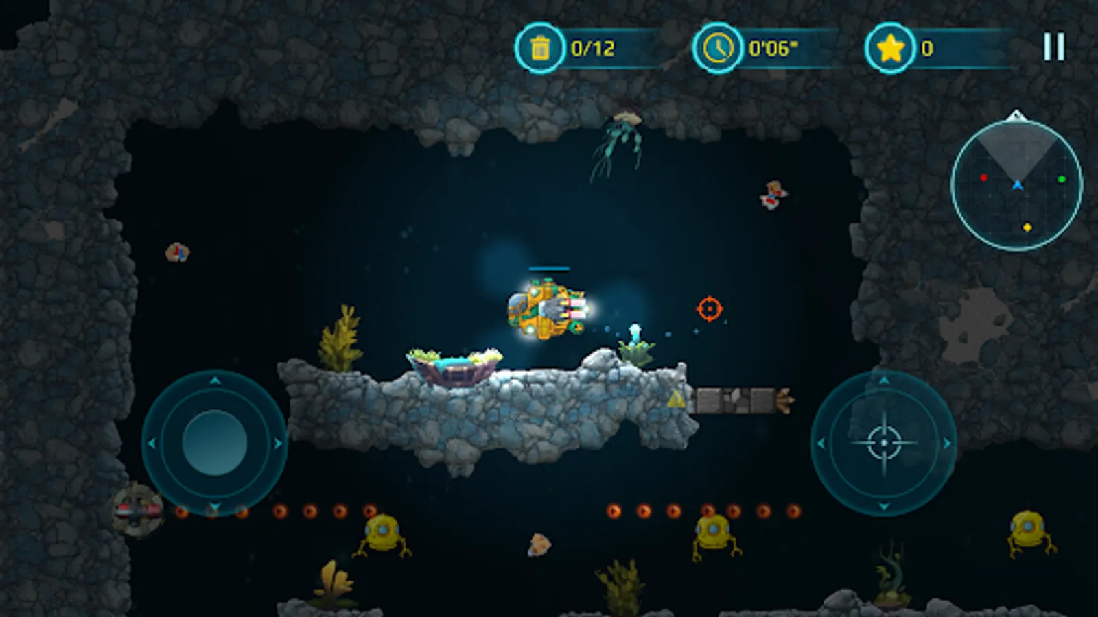 With a bright yellow submarine at your command, you'll venture deep into underwater caves and explore the mysteries of the ocean. Take on enemy creatures and defend yourself with powerful weapons, carefully avoiding the many hazards that lurk in the dark depths of the sea.