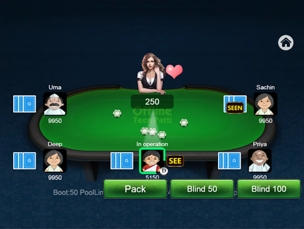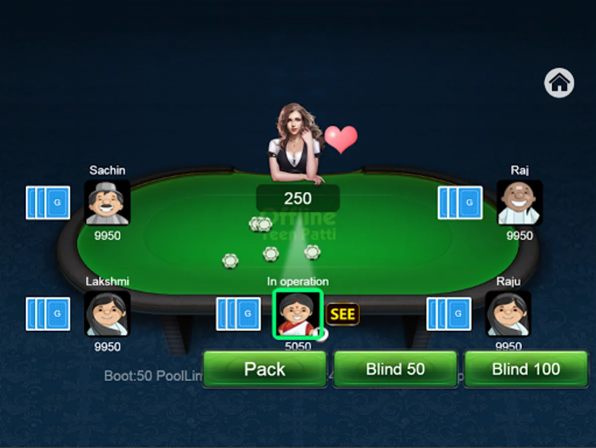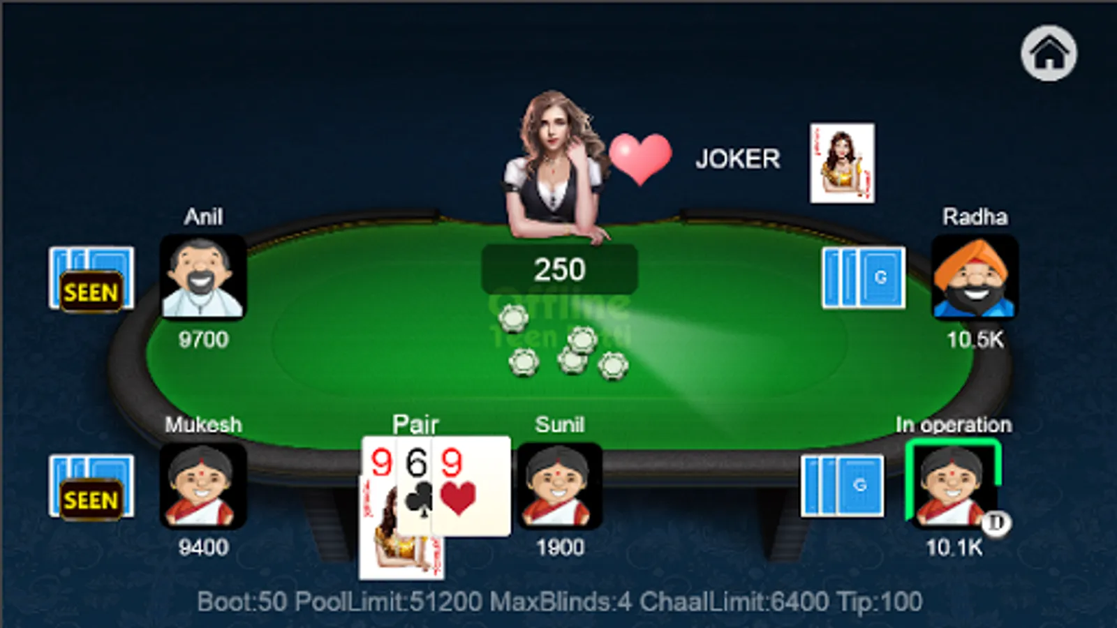 Teen Patti poker offline, Desi Style: Teen Patti offline poker is Indian version of Poker played with 3 cards, and is also known as Flash or Flush. Teen Patti table can have 5 players. Winning depends on your cards and moves.