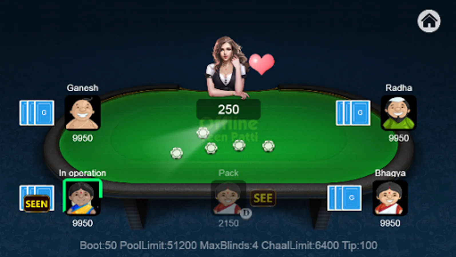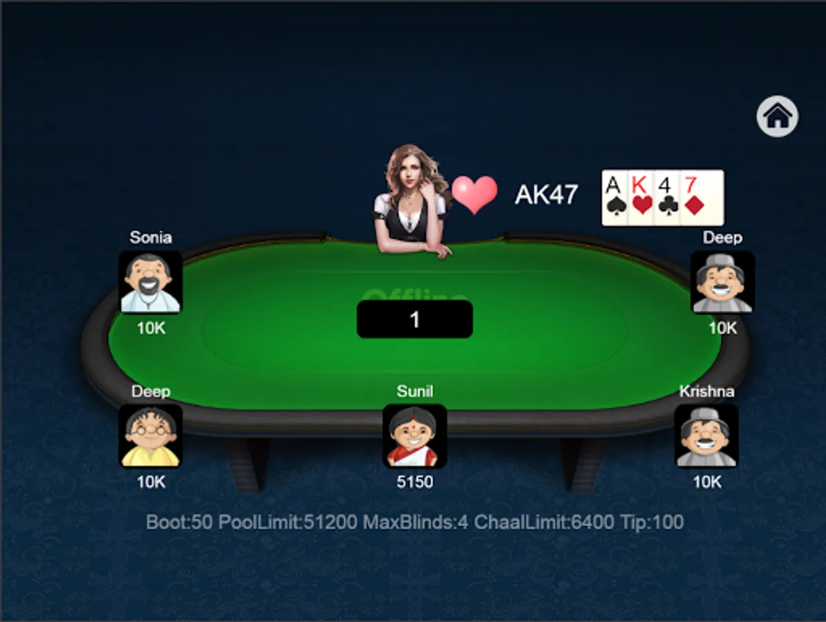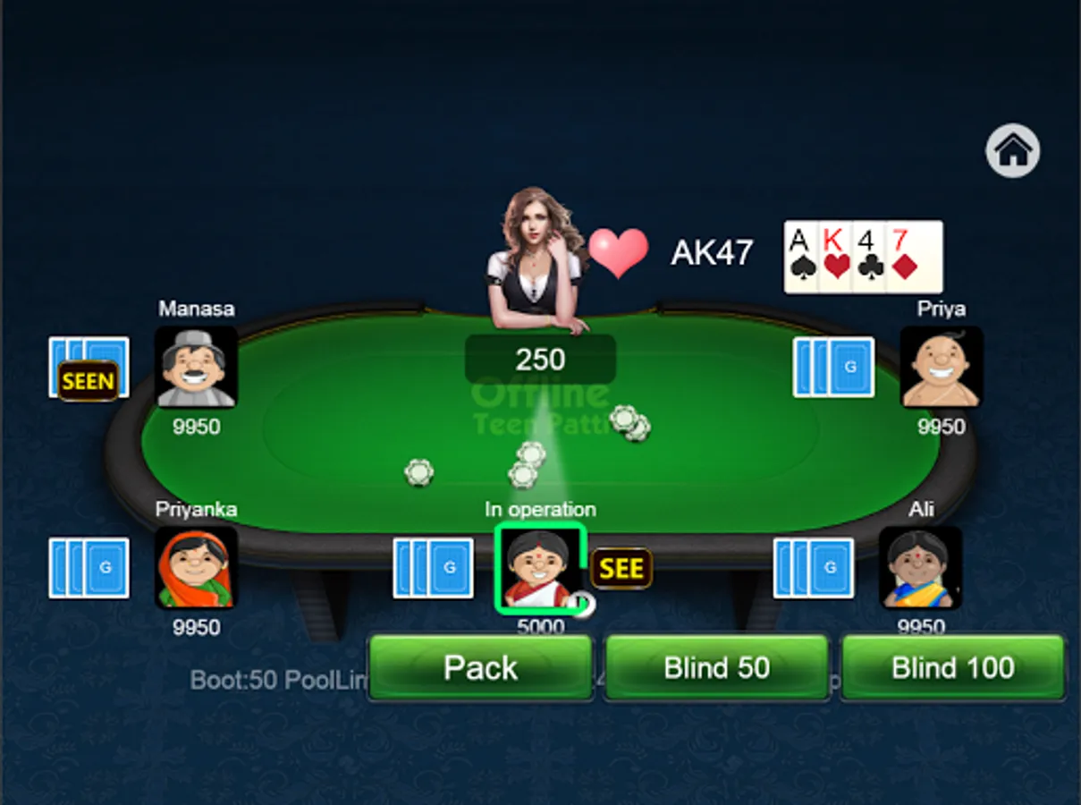 Teen Patti poker offline, Desi Style: Teen Patti offline poker is Indian version of Poker played with 3 cards, and is also known as Flash or Flush. Teen Patti table can have 5 players. Winning depends on your cards and moves.