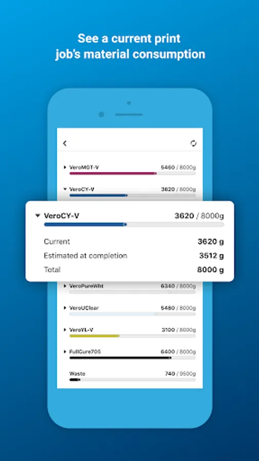3. View current material levels on the 3D printers, and plan refills / purchasing.