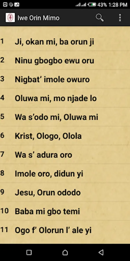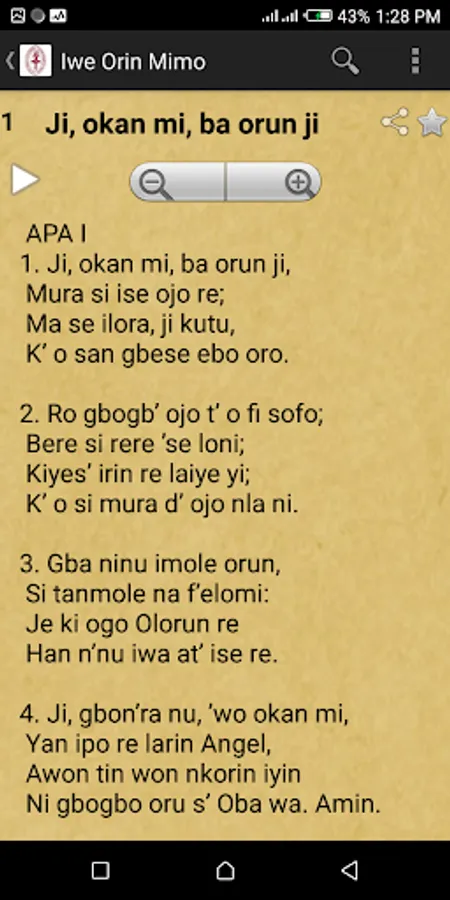 Complete Audio 600 Hymns from the popular Iwe Orin Mimo for the Anglican Church, The App has a search widget, share and favourite button for a great user experience, users can zoom in and out easily and browse the Hymns by Category. The Full version comes with Audio playback