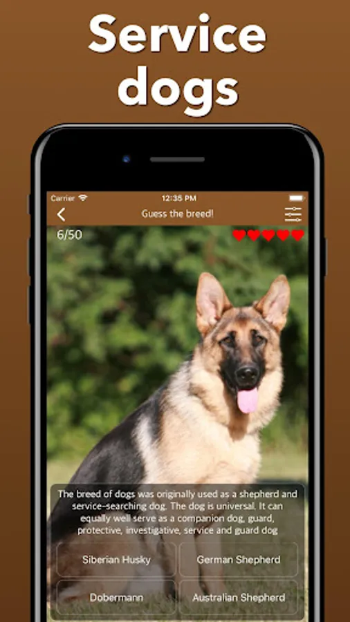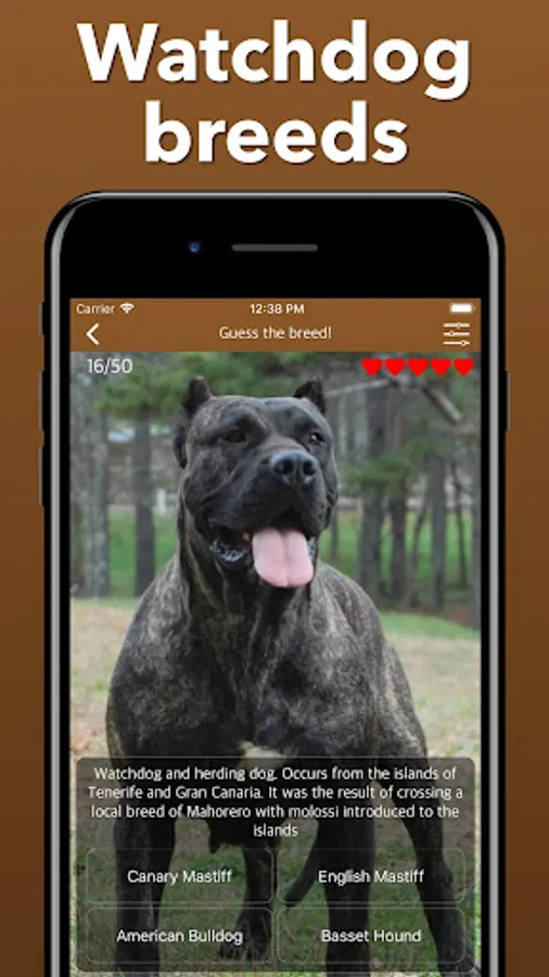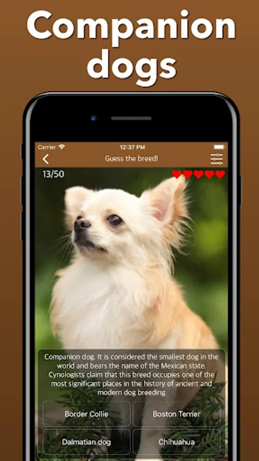 In this application you will find tips for all questions - for free! You can reach the end and guess all the breeds! Their history and country of origin! Interesting Facts! From England, Germany, USA, France, Spain, Portugal, Russia, Italy, Slovakia, Finland, Norway, China and Japan! From all over the world! Dog games for education, training and learning! This is not pet simulator! This is Pet training and learning app, history, habits and pedigree!