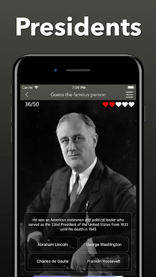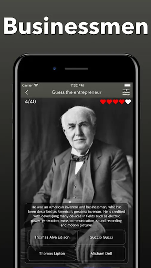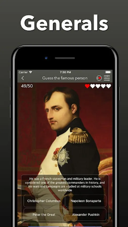 The game is built on the type of test. You need to answer the question using 4 possible answers, a photo of a famous person and a description-hint. In this game of history, 5 “lives” are available to you. One wrong answer is minus one life. But you will always be offered an extra life when you need it.