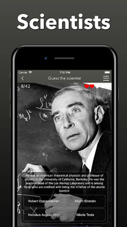 A great app for anyone who studies world history. Take the story test to the end! Learn and guess great mans! Test your knowledge of history! Discover new great people for you!