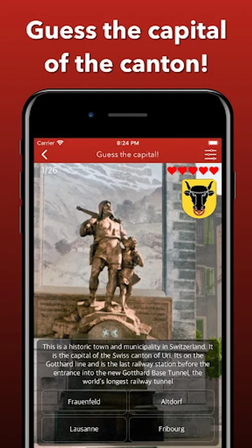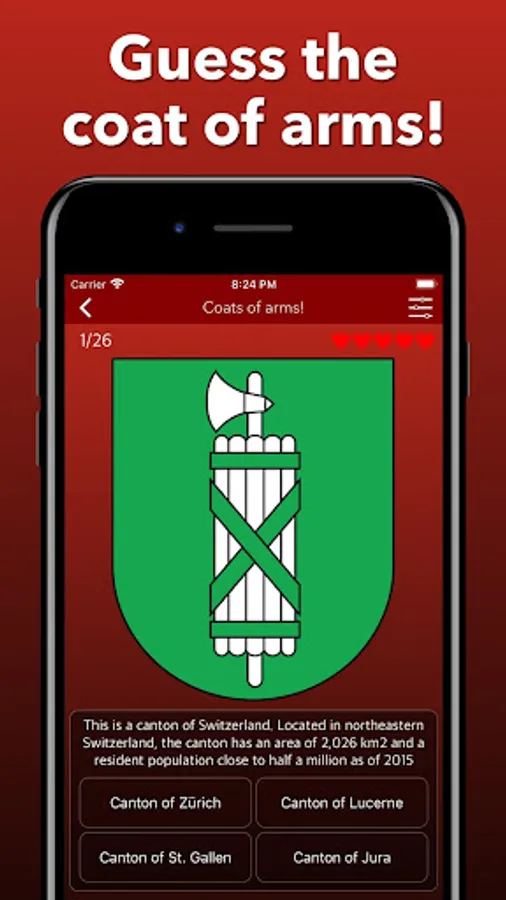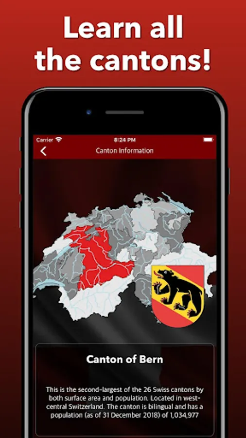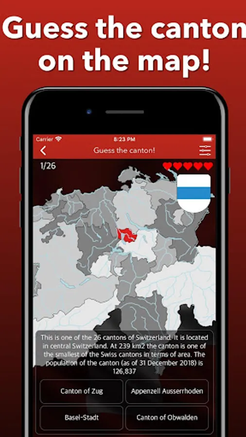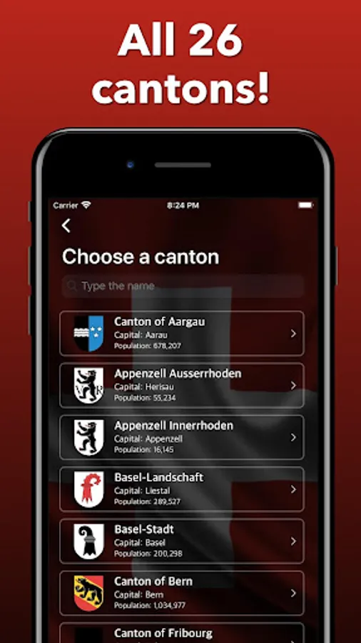 Explore and guess all 26 cantons of Switzerland! Maps, coats of arms and capitals of all 26 cantons! All in one app!