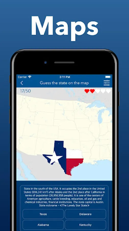 In this application you will find tips or interesting facts for each question. Learn a lot about America and its history. The flags and maps of the USA!