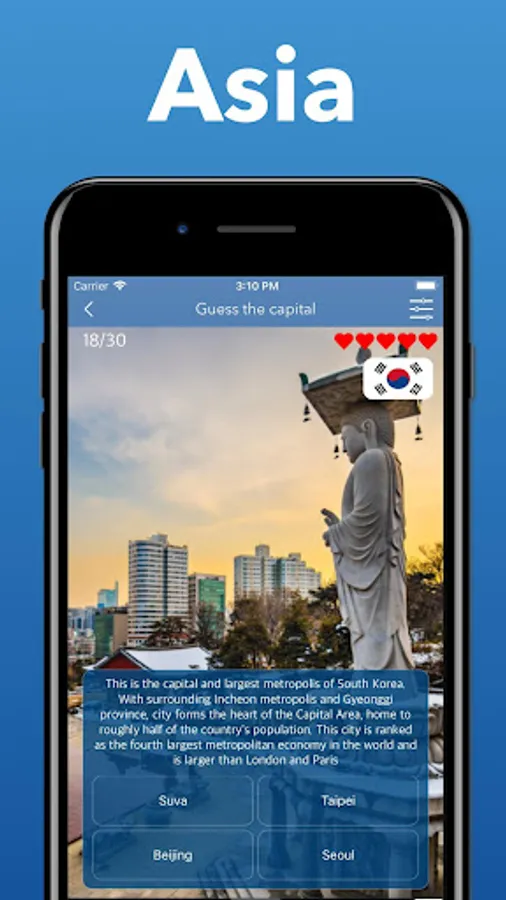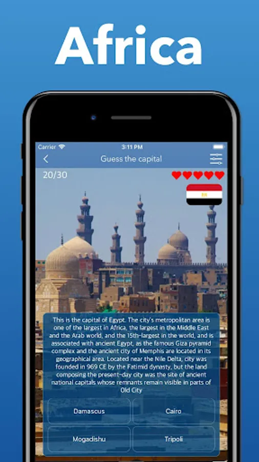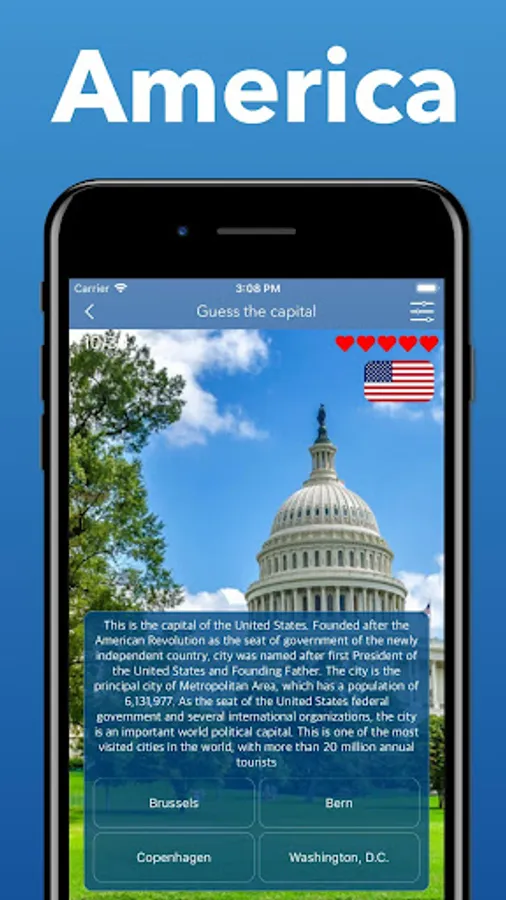 This is a great educational quiz game for anyone who love traveling and interested in geography. Guess and learn all the world! All Continents! Explore the world!