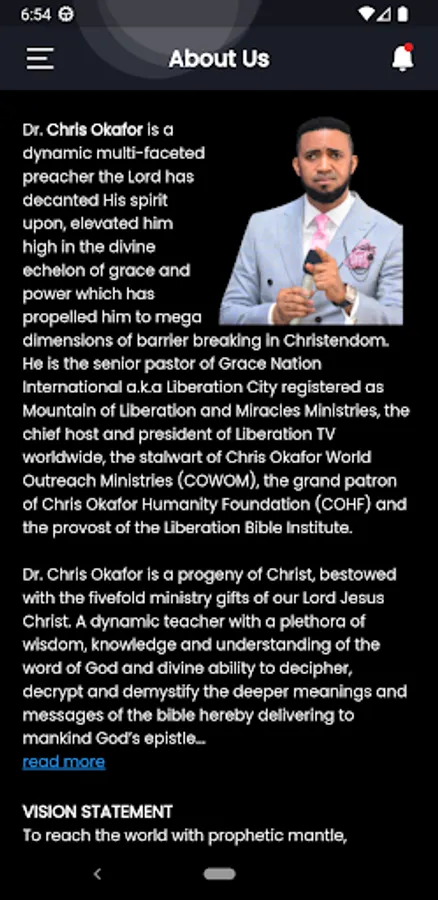 This is the official mobile app of Grace Nation (Liberation City) lead by our senior pastor Dr. Chris Okafor; Dr. Chris Okafor is a dynamic multi-faceted preacher the Lord has decanted His spirit upon, elevated him high in the divine echelon of grace and power which has propelled him to mega dimensions of barrier breaking in Christendom.