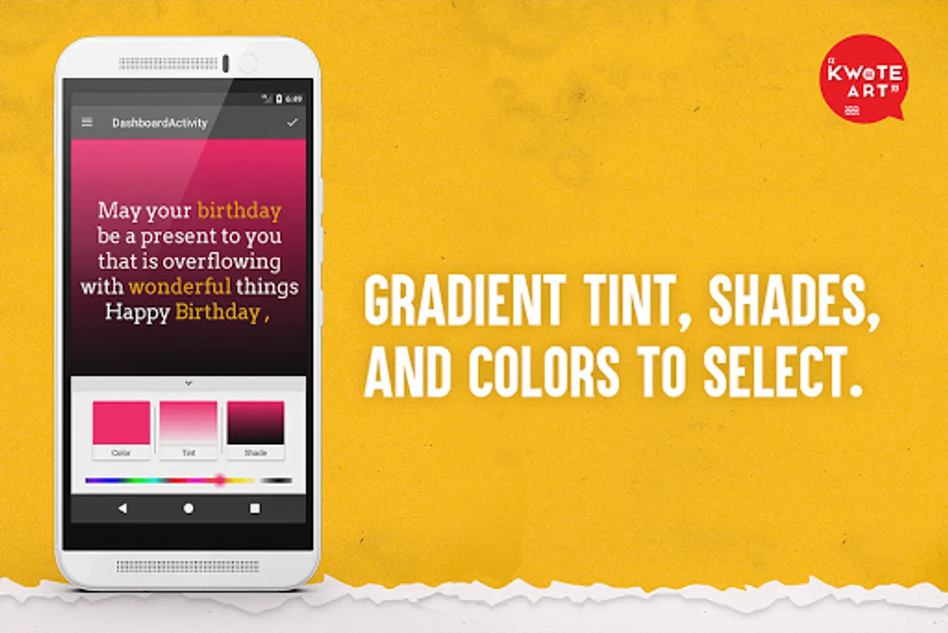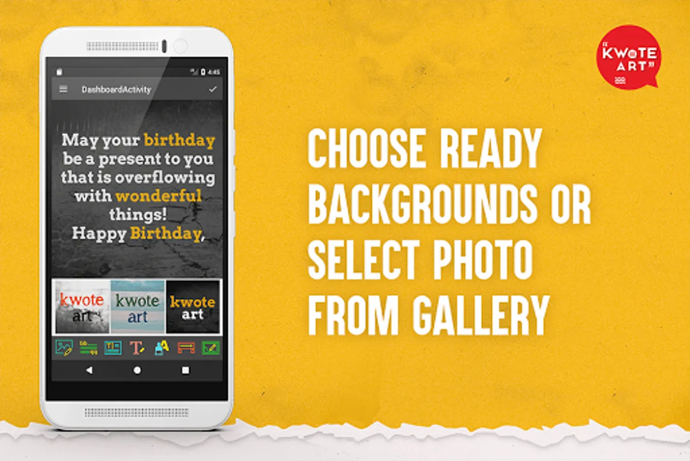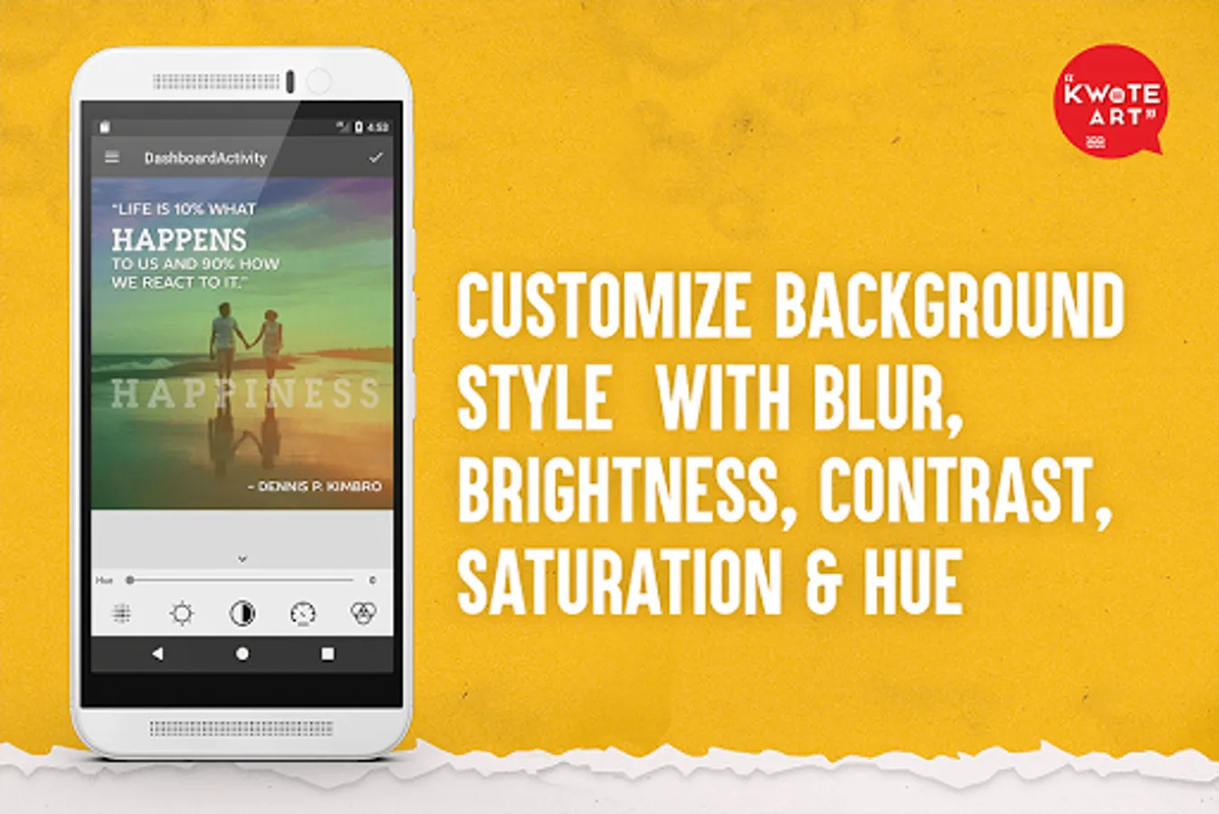 KwoteArt let you create your own quote image in very simple way. There is an options to select background like select from gallery , ready background, gradient shades and colors. Save and share once you create your image