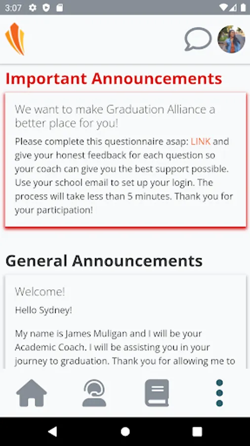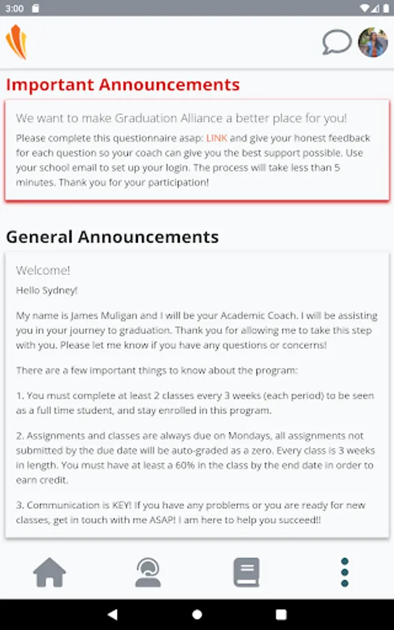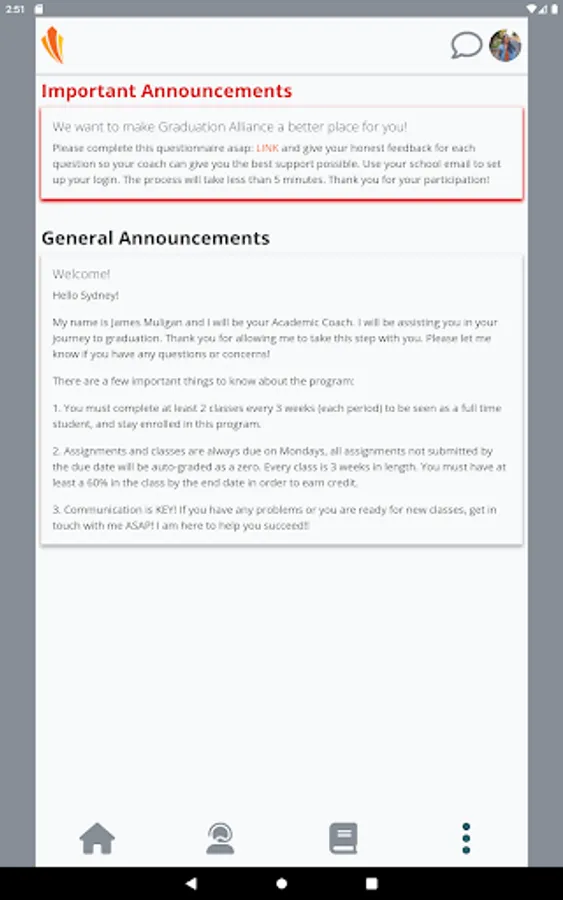 As a Graduation Alliance student, you can access your school portal to check class progress, get the latest updates, and chat with your support team. This app does not allow you to access assignments or complete coursework, this can only be done using the web portal.