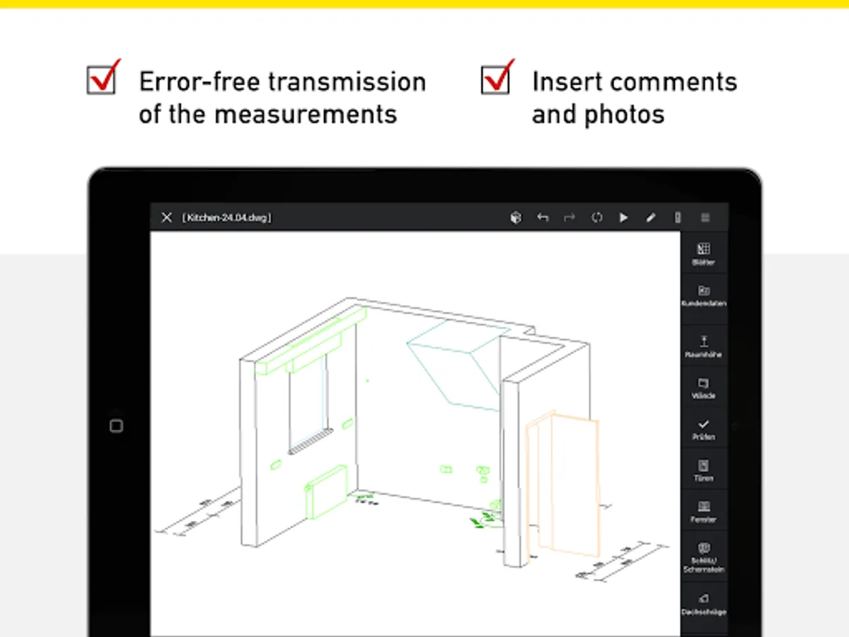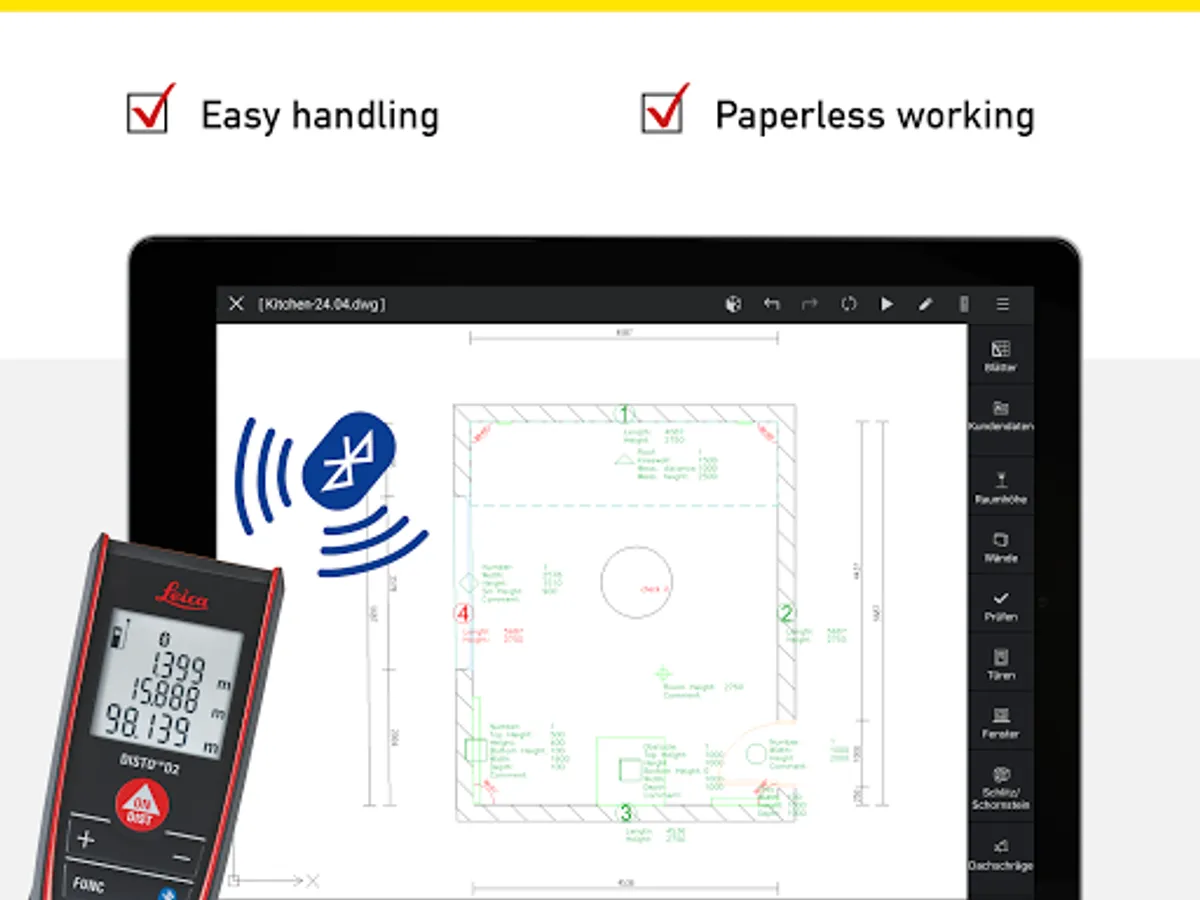 The digital transmission of measurements increases quality and reduces errors. With interfaces to the leading designing software, the kitchen planner can continue to use the measurements of every kitchen measurement.