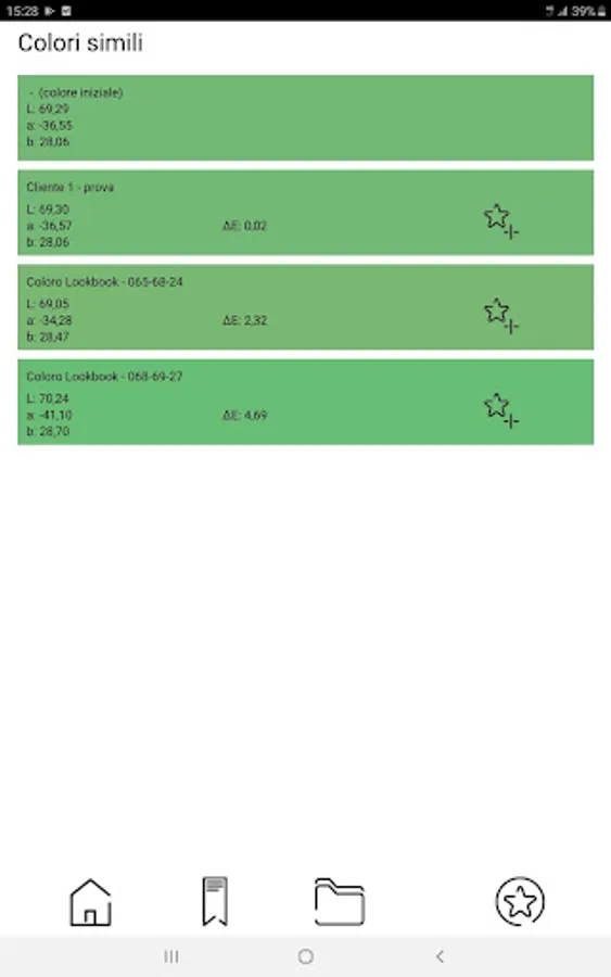Starting from the acquired color the App shows the three nearest colors of some of most common color folders (Personalized palette, RAL, Coloro LookBook); for these colors you can get the Grafco recipe for the color production (given mesh and product line).