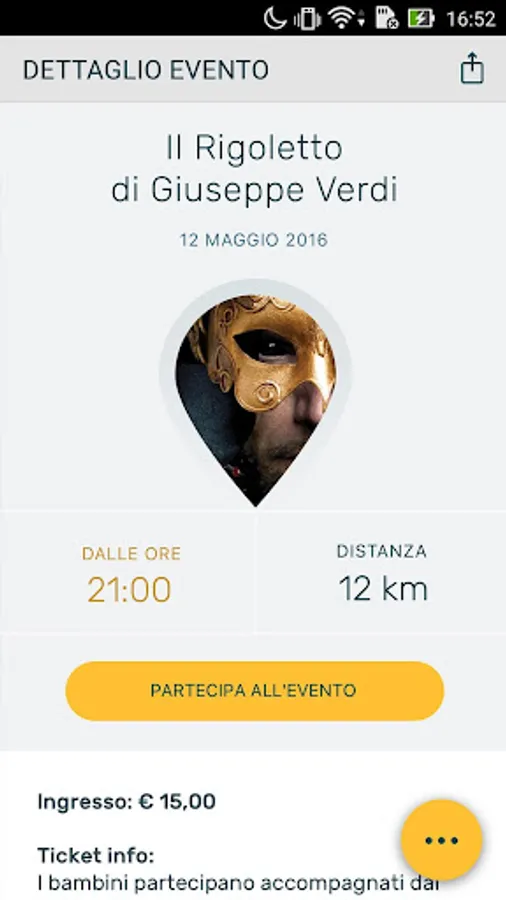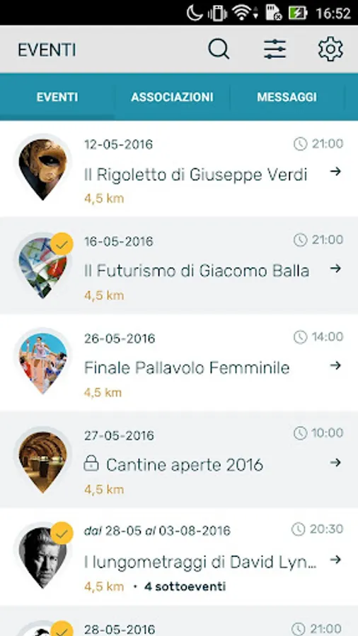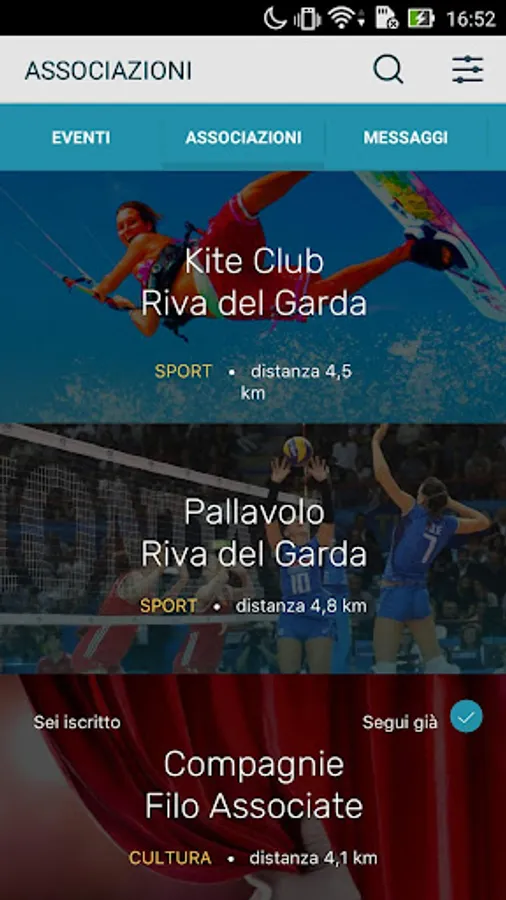 - FEATURED EVENTS: the association can configure an event and associate it with one or more subject areas, while the user can filter the types of events that interest them. Each event shows the date and the distance from the user at that time