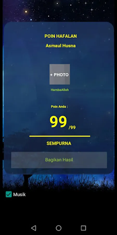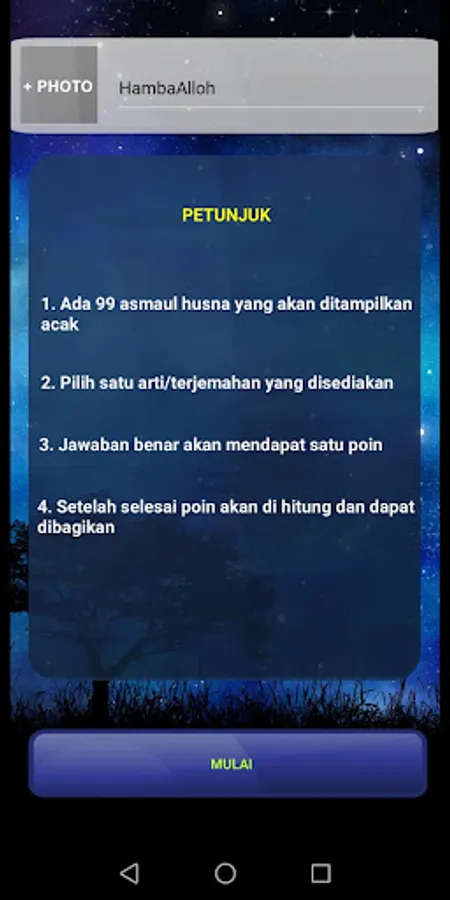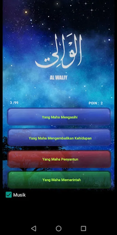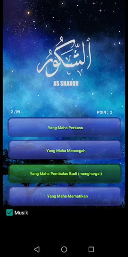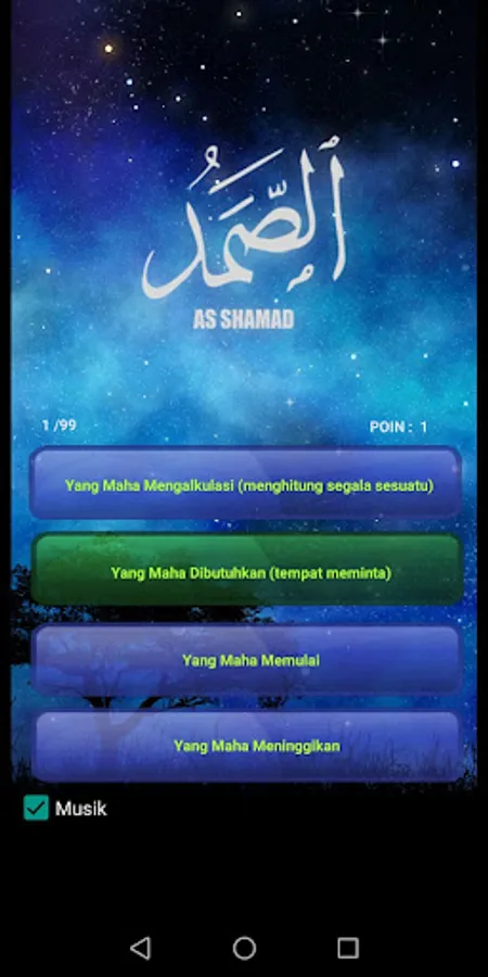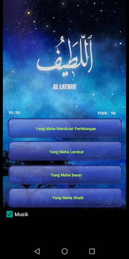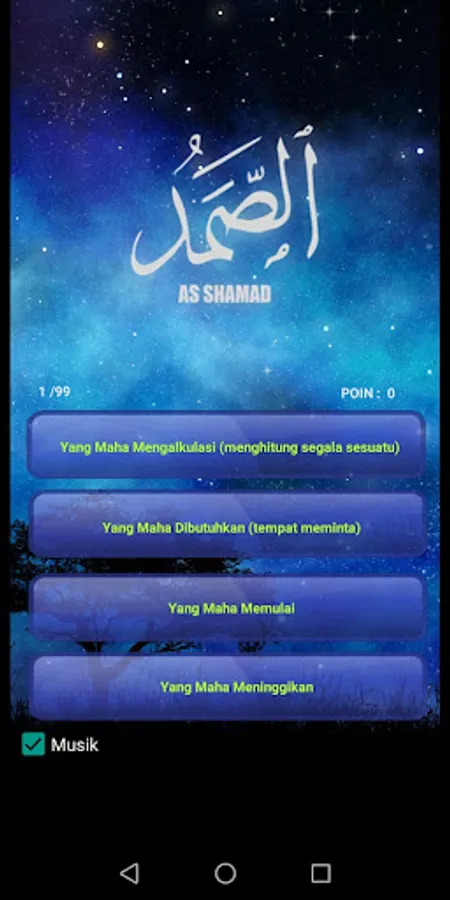 Therefore let with this application we memorize Asmaul Husna. Asmaul Husna memorization in this application is presented in the form of a quiz accompanied by the song Asmaul Husna.