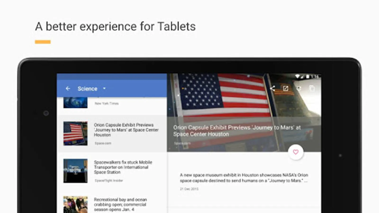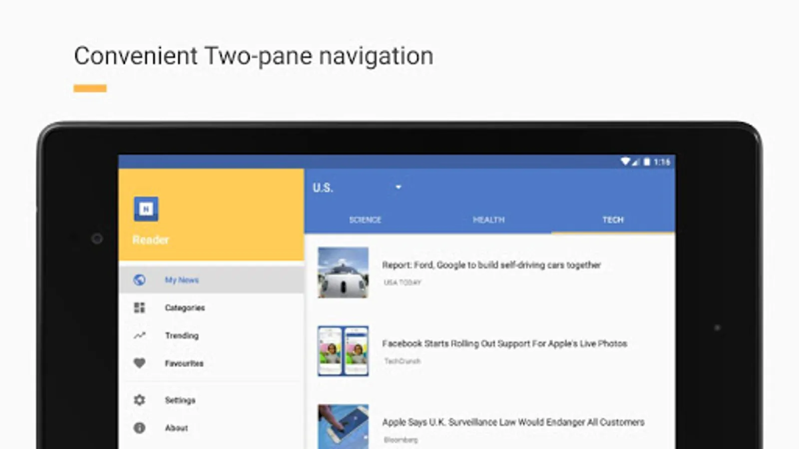 Taking advantage of a larger screen, Newslet knows how to adapt content. The Tablet experience is different altogether. Using two panes for news and articles, you can do more from the same screen.