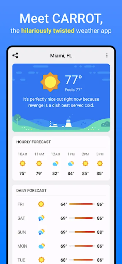 CARROT Weather is a crazy-powerful weather app that delivers hilariously twisted forecasts.