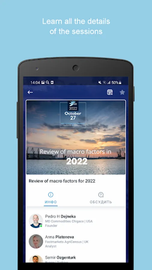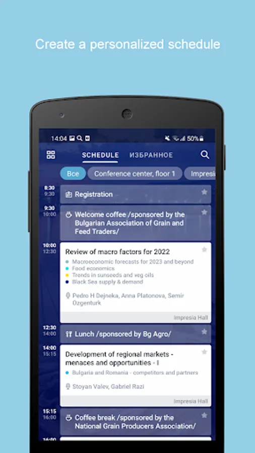 - Create your own schedule and receive notifications about the beginning of the selected sessions;