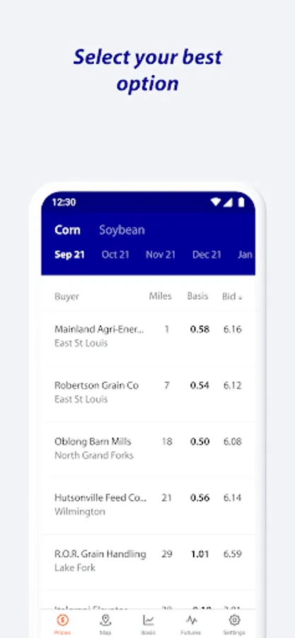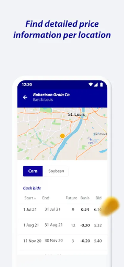 With the Rabo Graintell app, you can see cash bid information for soybean and corn from multiple buyers in your area and quickly compare the basis of local buyers.