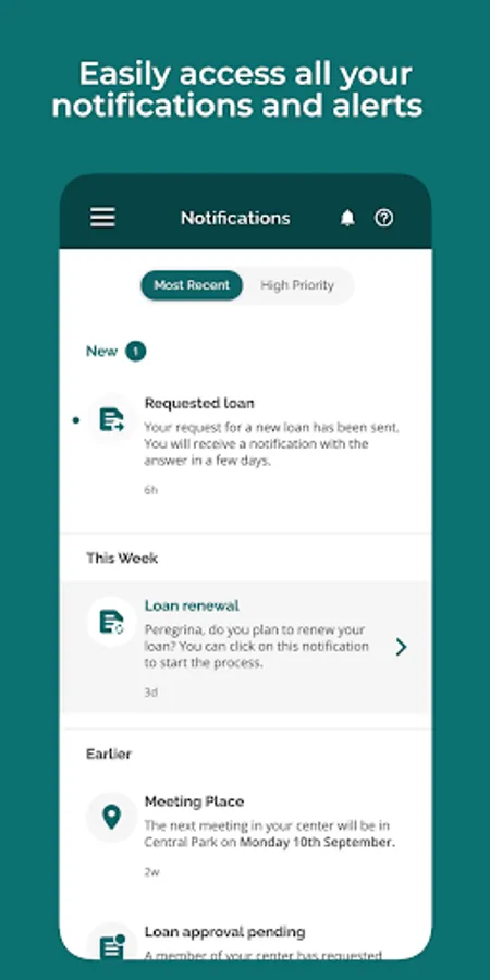 • Get notifications when a loan payment is due, your Center meeting is starting, you have a new loan to approve, and more