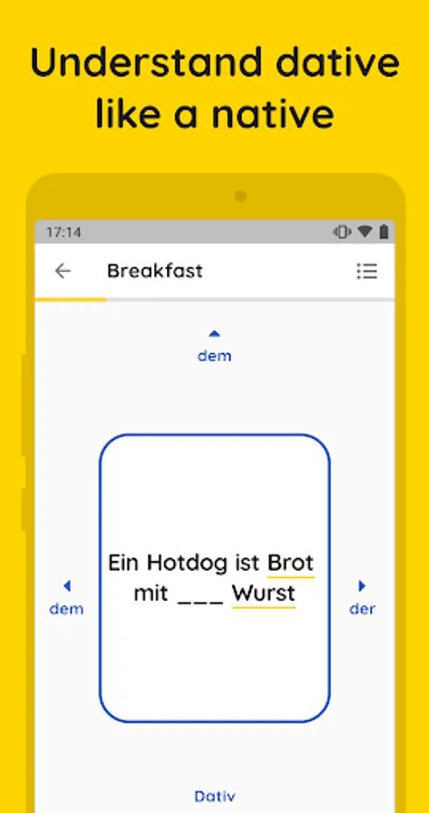 Enter Grammapp. Probably the fastest (and most delightful) way to learn German grammar and build your vocabulary. Set aside the daunting word tables and jargon. Start swiping your way to perfect German grammar, one card at a time.