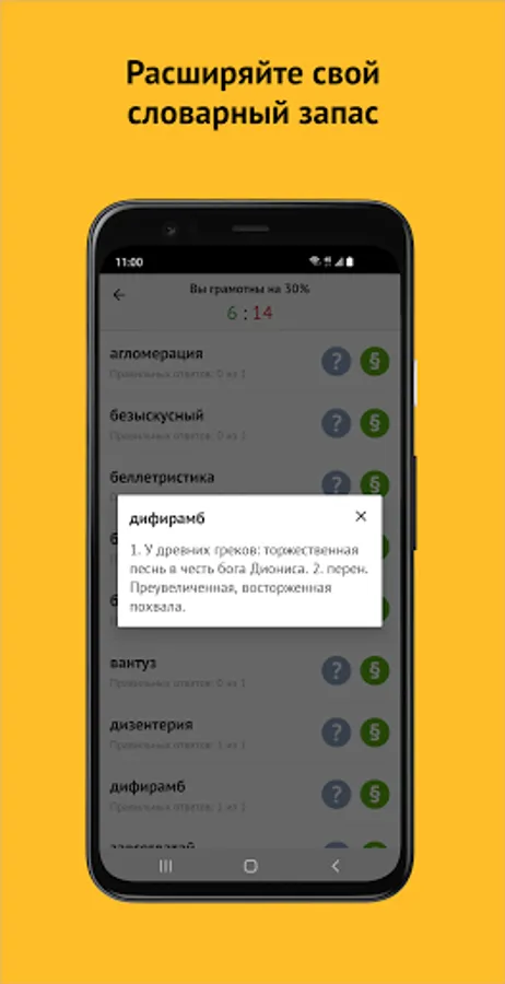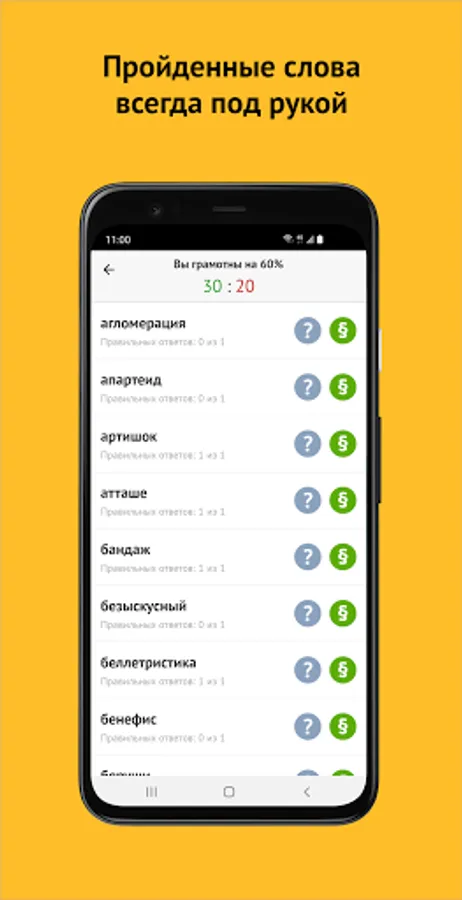 There is quick access to all the words passed through - you can always refresh your memory of the rules of the Russian language and the meaning of the word.