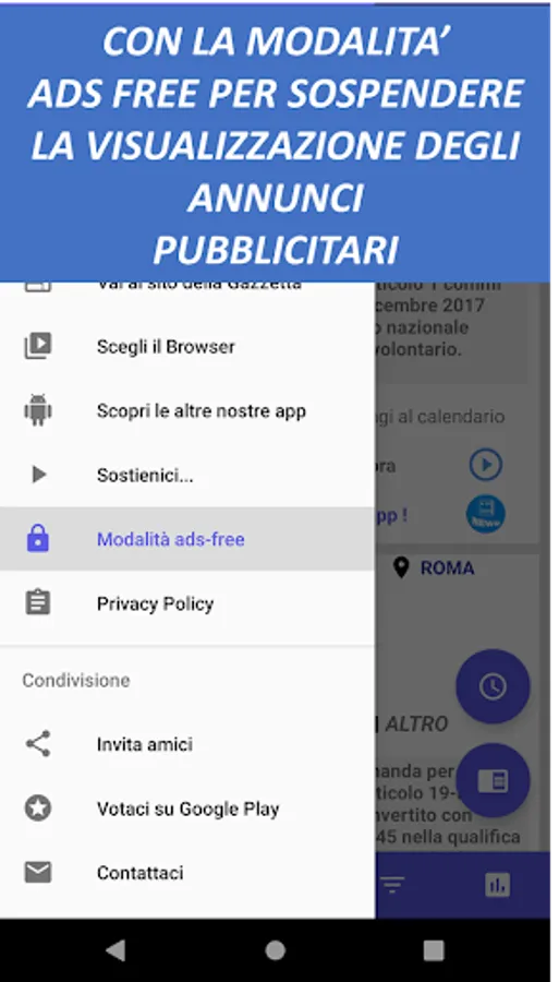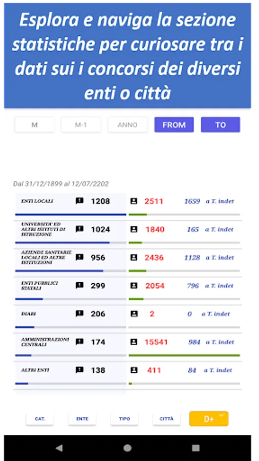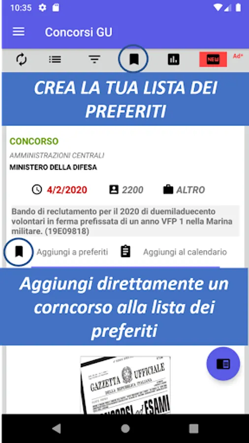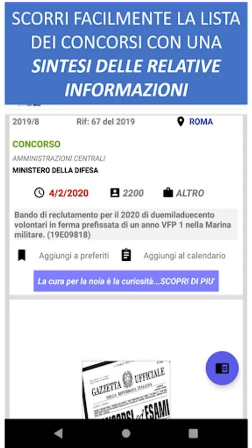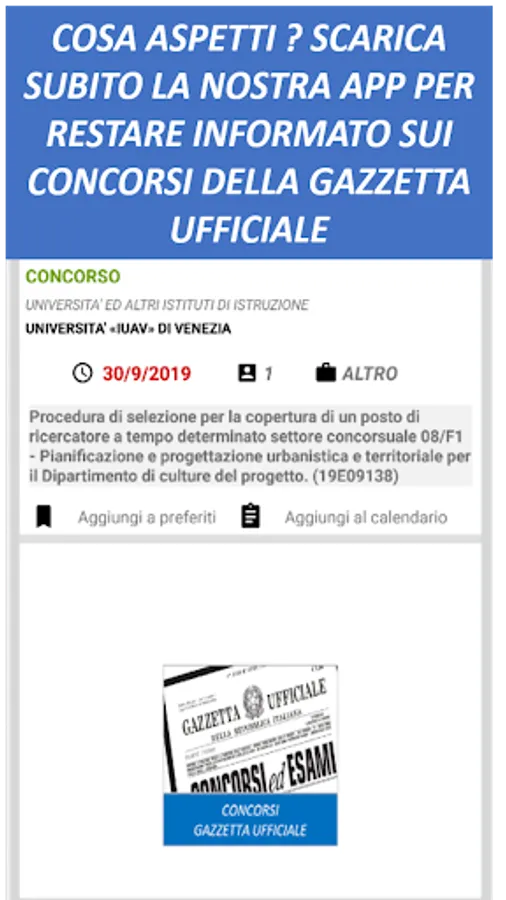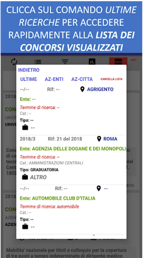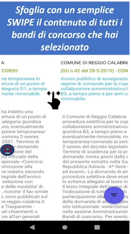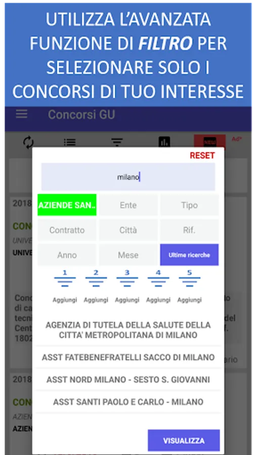 There is also an advanced filter function that allows you to save up to 5 favorite selections (eg Filter 1: all the competitions on rome of the ministry of defense, Filter 2: all the competitions of the university of the favorite city) just select the items of interest and long press on the red button of the filter you want to set.