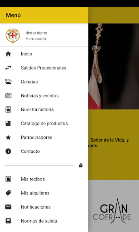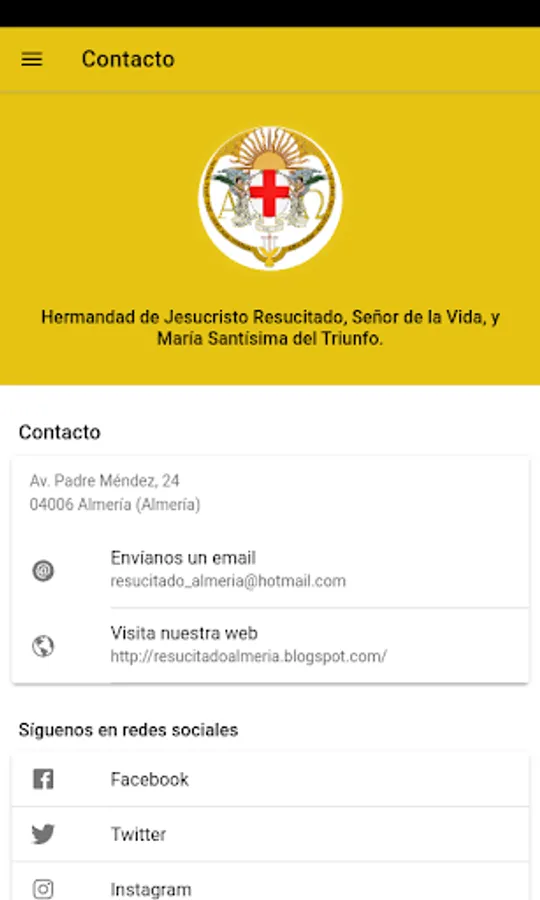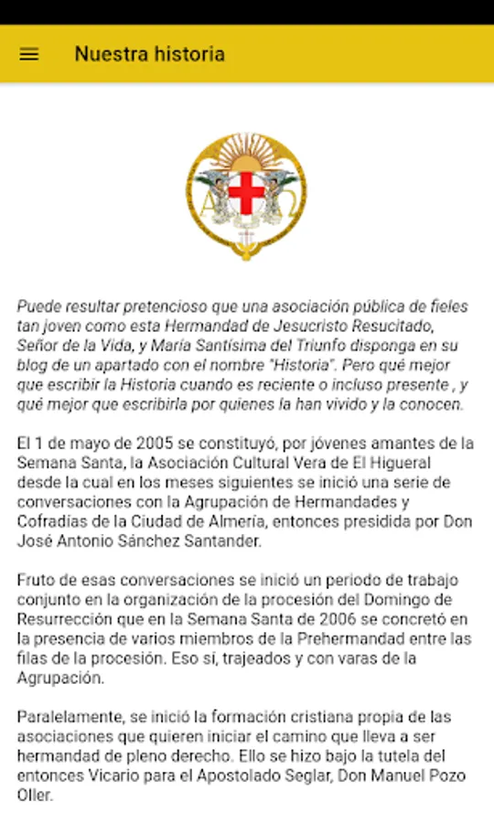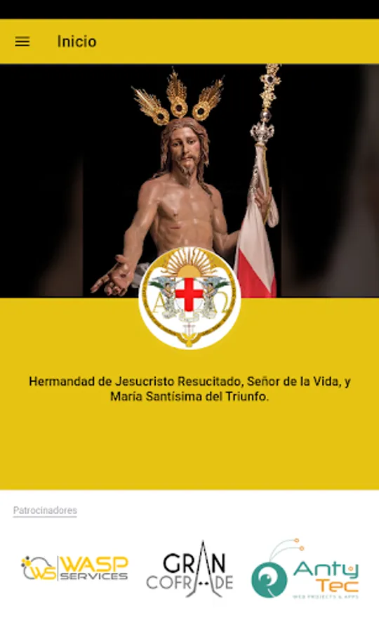 Official application of the Brotherhood of the Risen Jesus Christ, Lord of Life, and María Santísima del Triunfo de Almería, next departures and identified access for the brothers / sisters in which they can consult / modify their personal data, check receipts and receive notifications of the Brotherhood.