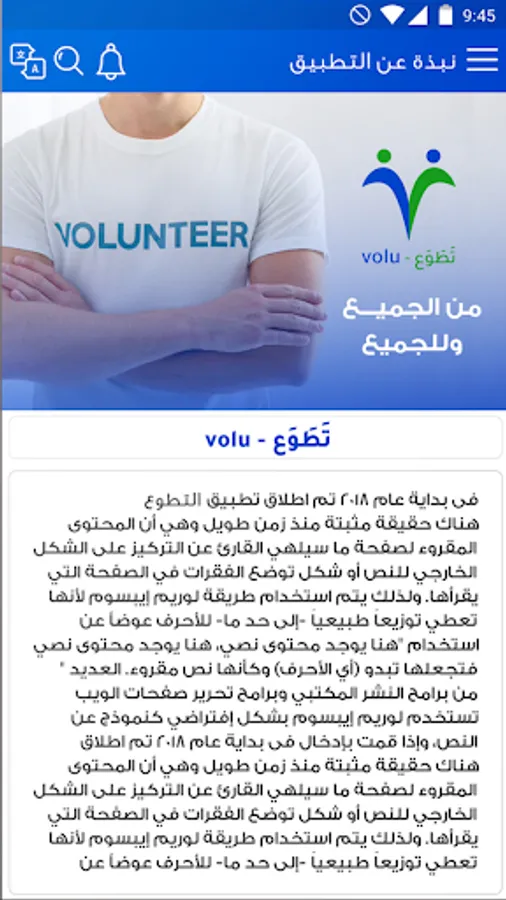 • Volu app is an international Arabic application that facilitates volunteering for all in light of volunteering facing many challenges and obstacles that in turn reduce the effectiveness of the volunteering process.