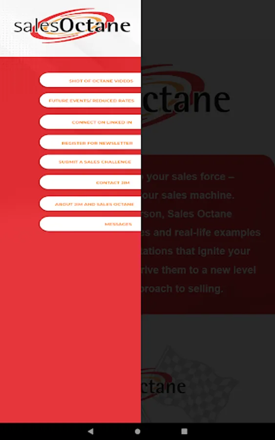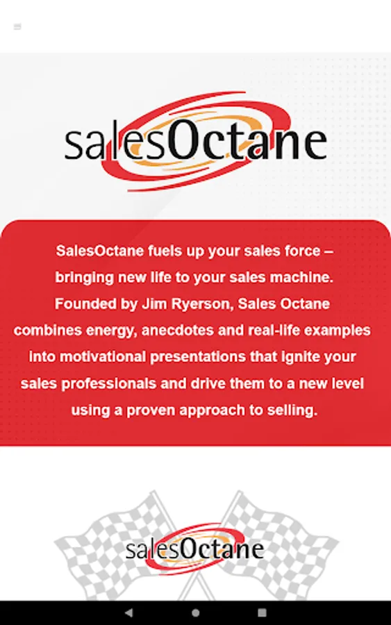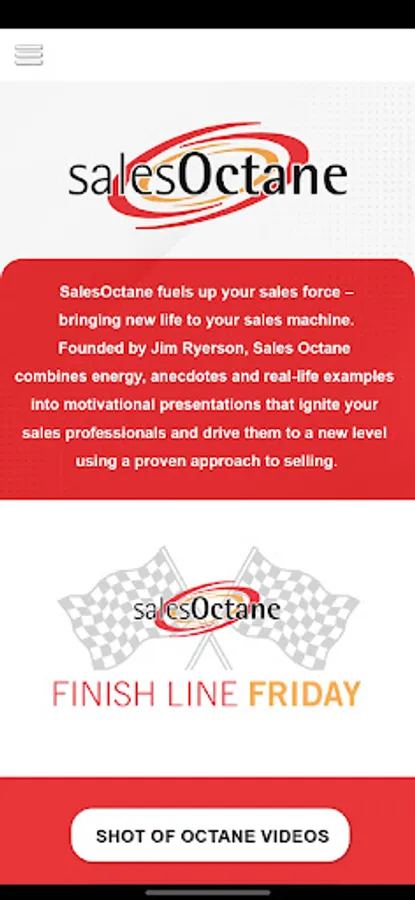 Download the FREE Shot Of Octane App providing uber-short, hyper-focused sales training videos created by Sales Octane founder, Jim Ryerson. Videos are based on the best-selling book series, First 100 Days of Selling by Jim Ryerson and feature other sales content experts in addition. The Shot Of Octane videos align with steps in the sales process and will equip you and your sales talent with world-class sales training. Shot Of Octane is your one-stop mobile sales coach!
