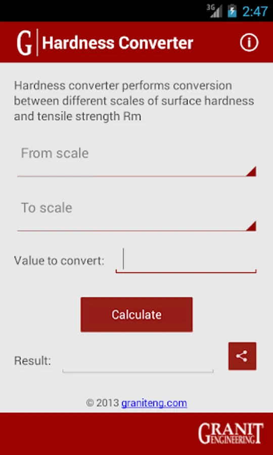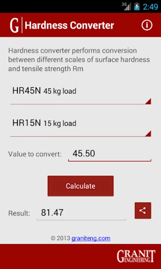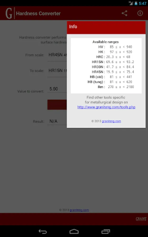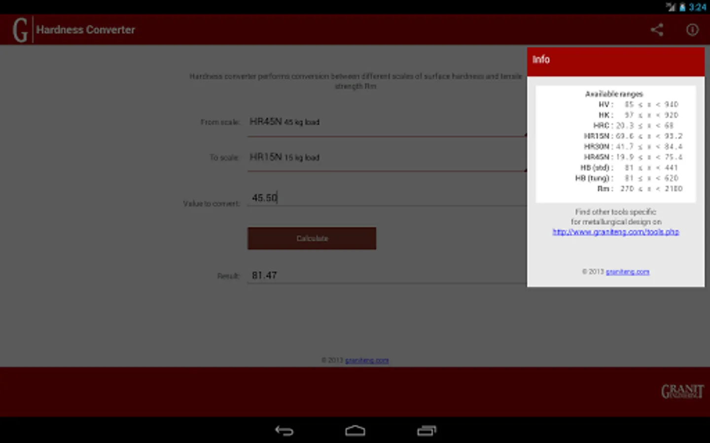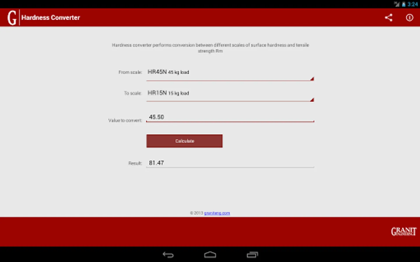 Granit Engineering Hardness Converter ( http://www.graniteng.com/index_eng.php ) is a mechanical and metallurgical design application which performs conversions between different scales of surface hardness and tensile strength Rm.