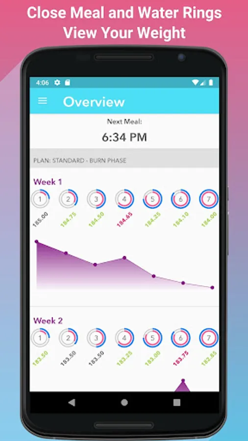 ***In-App Purchase - Overview Details. The Overview Screen can now show a graph representation of your weight for the week. It will also show what time your next meal is at the top of the screen.