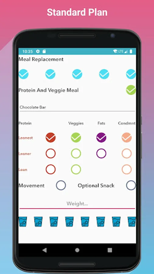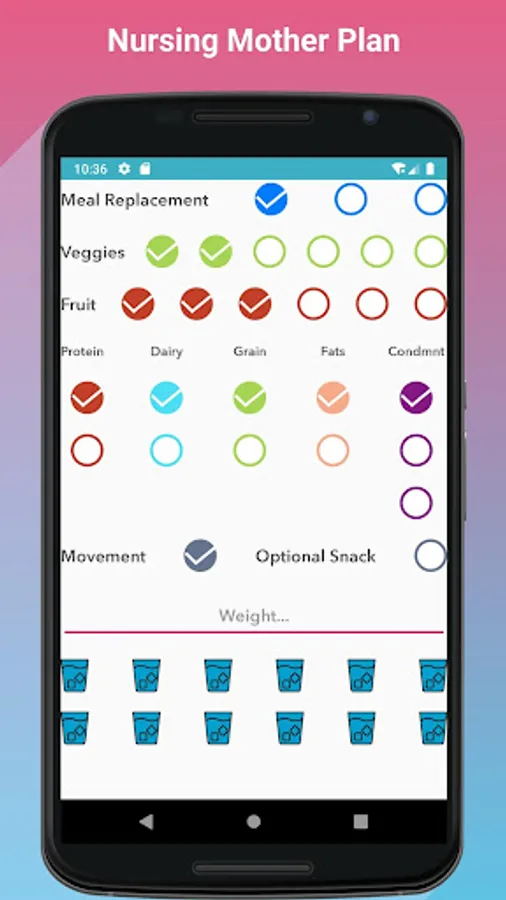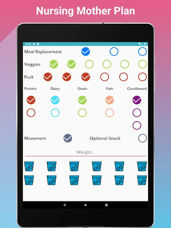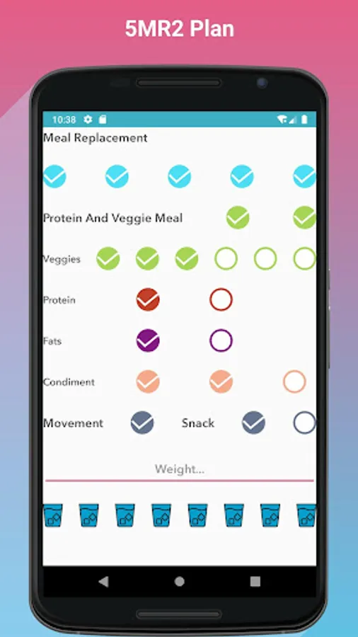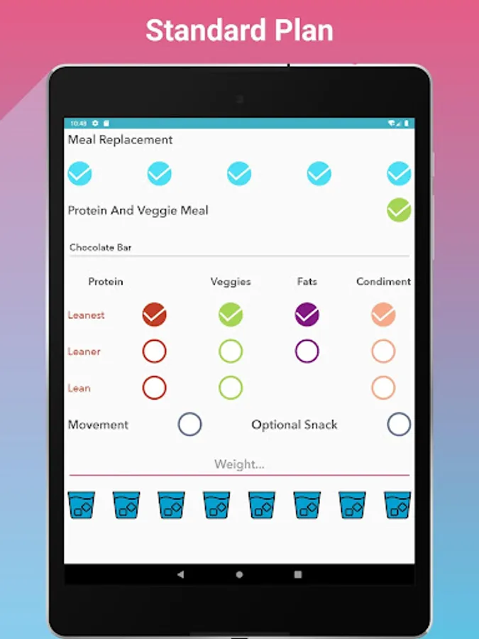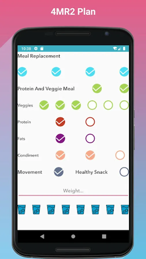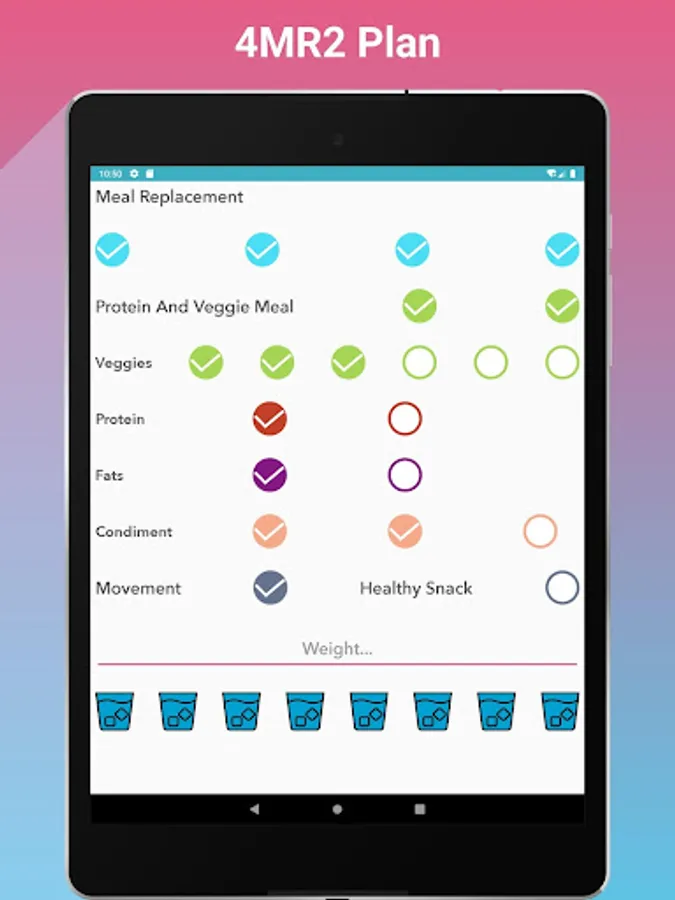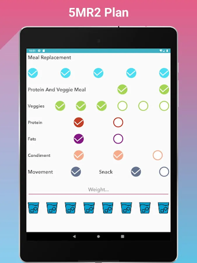 MR tracker is simple and easy to use. Simply select the week and the day then mark the meals, optional items, and water as you eat/drink them.