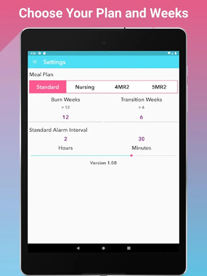 ***In-App Purchase - Custom Alarm. Set you default alarm interval. Interval ranges from 15 min to 3 hours 30 min in increments of 15 min. You can also set a 1-time alarm for you next meal after you checkmark a meal. 1 time alarms don't change the overall default alarm interval. This is great for those times when you forgot to checkmark a meal and need a shorter alarm for your next meal or if you know you have an appointment when your next meal is supposed to be, you can set the 1 time alarm for before or after your appointment.
