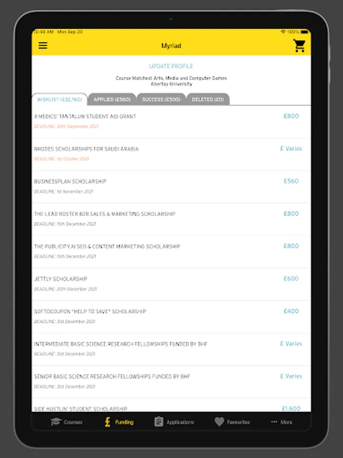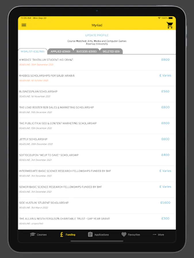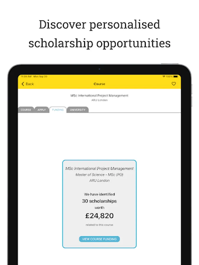 Our personalised scholarship matching service gives you a tailor-made list of scholarships that you are eligible to apply for, providing easy access to grants and scholarships applicable to your course. You can shortlist funding opportunities, apply to the awarding bodies directly and even get notifications so you never miss a scholarship deadline.