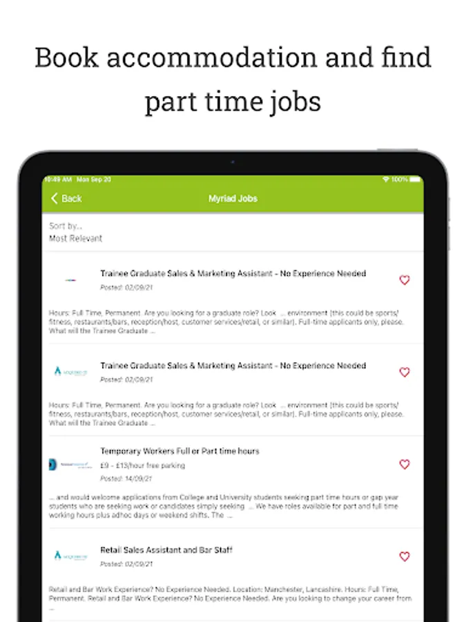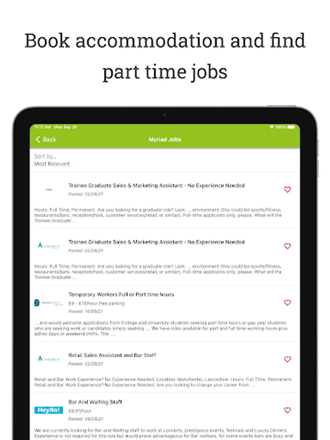 Myriad jobs can help you search for part-time work to help manage your student costs, and full-time employment opportunities for when you graduate. You can search for employment in your local areas, shortlist jobs and apply directly, all from the convenience of your mobile phone.