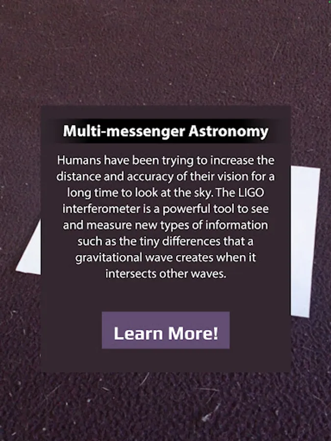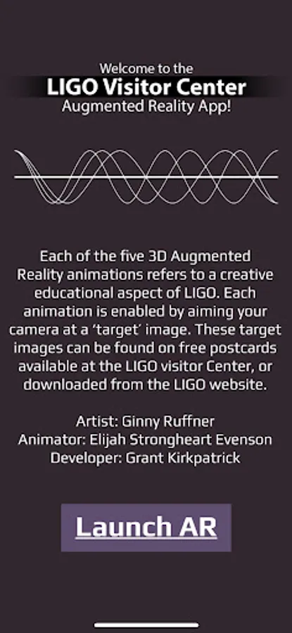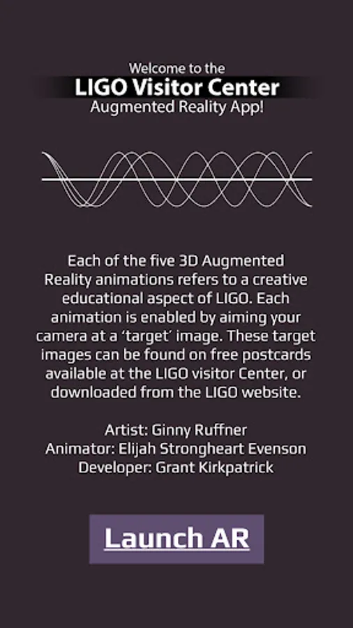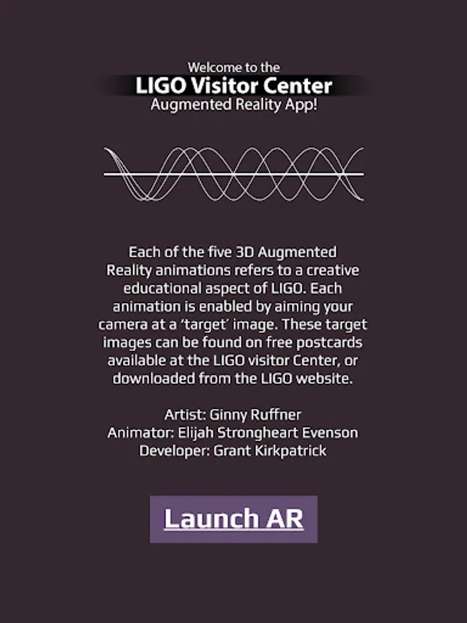This app is a companion to the LIGO visitor center. Visitors can download this app to activate a variety of provided postcards to learn more about how our Laser Interferometer works and to view artistic interpretations of the scientific work we do.