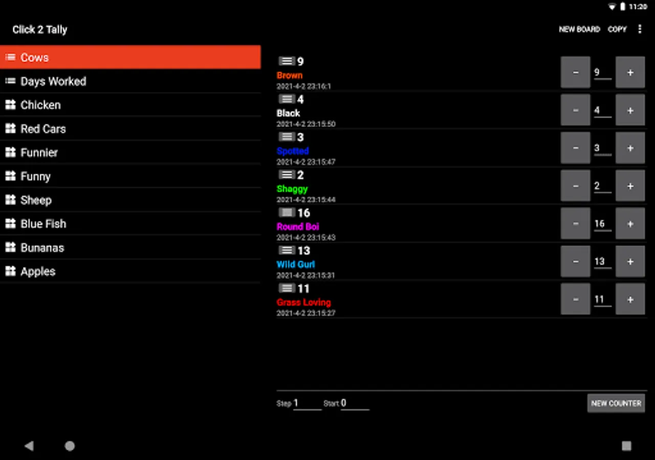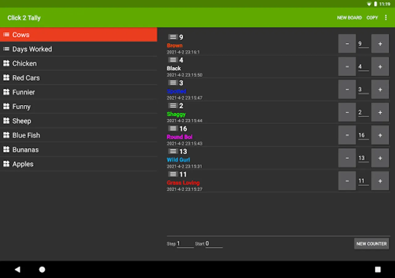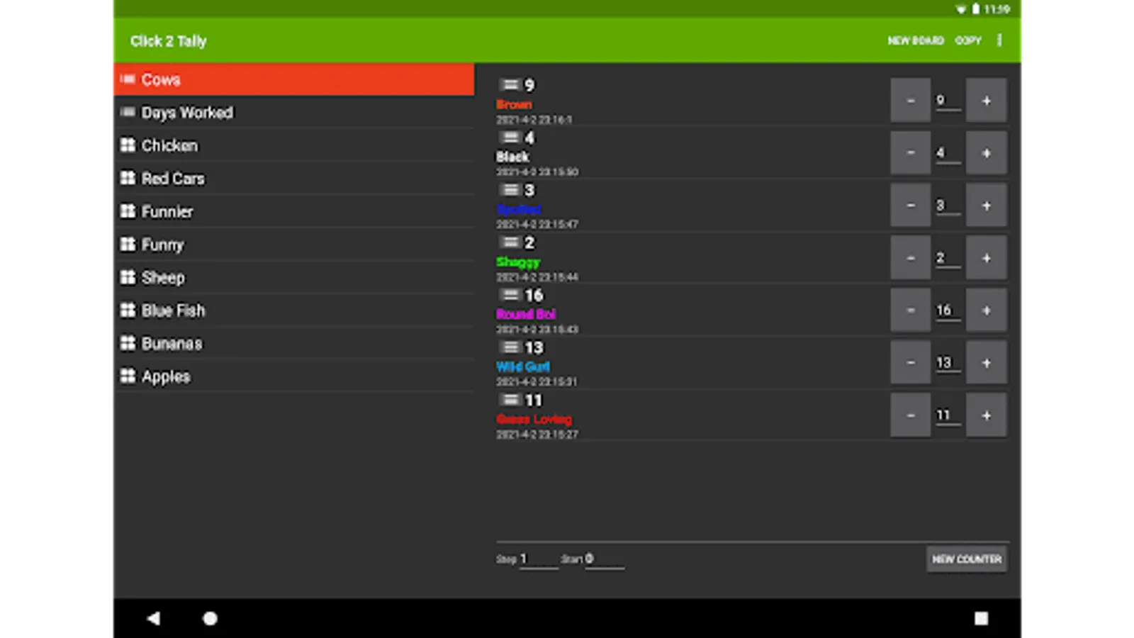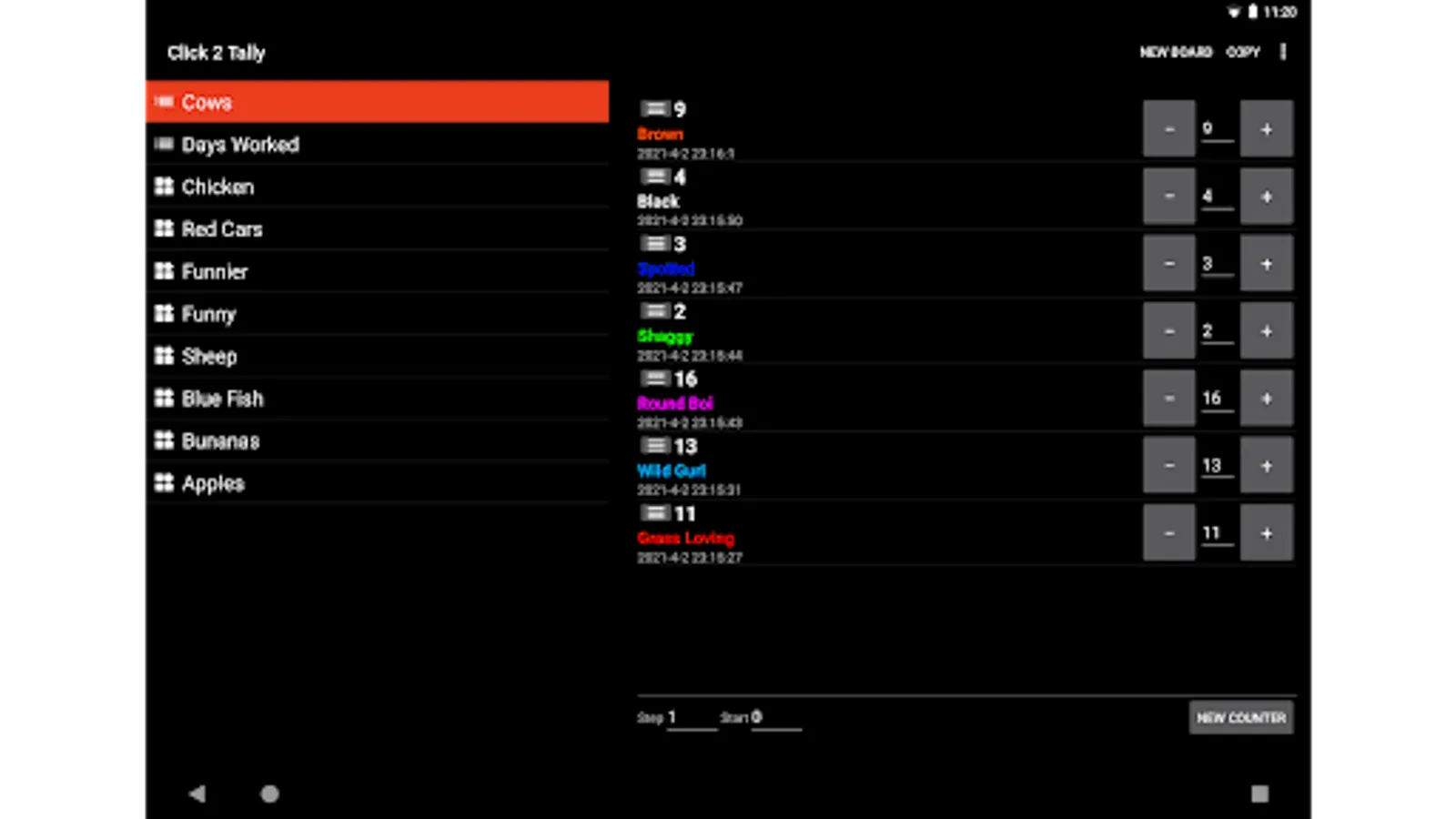 You can keep track of multiple counters at once and organize them into "Counting Boards". Choose how much to count by ("step") and what to start at. Negative and non-whole numbers are supported. Numbers can be very large. You can also convert numbers to tallies (integers 1-99,999). There are various settings. It has a home screen widget.