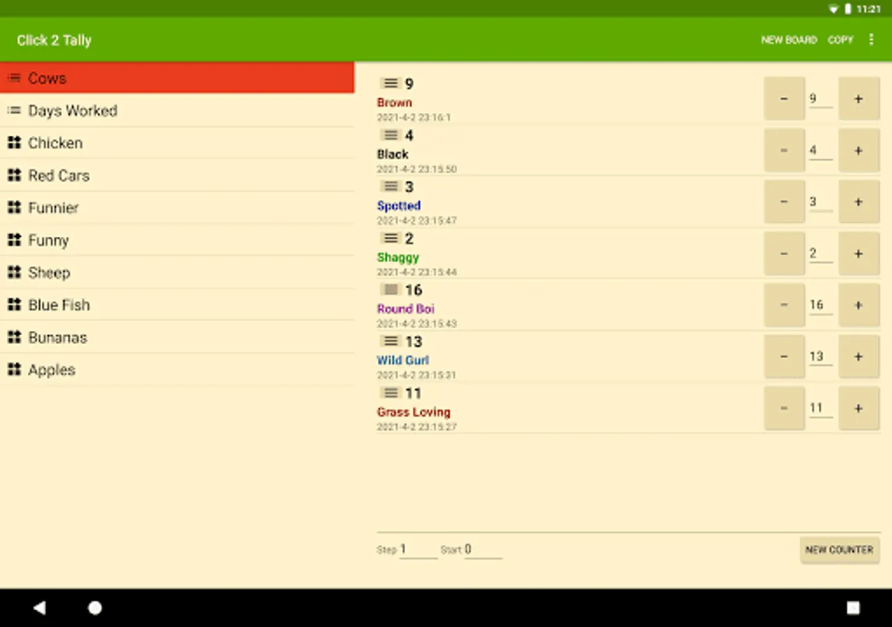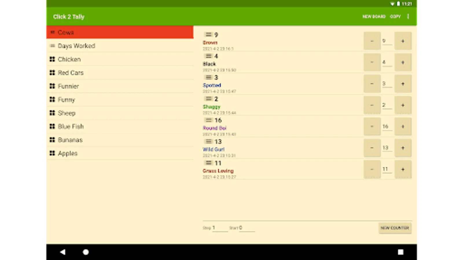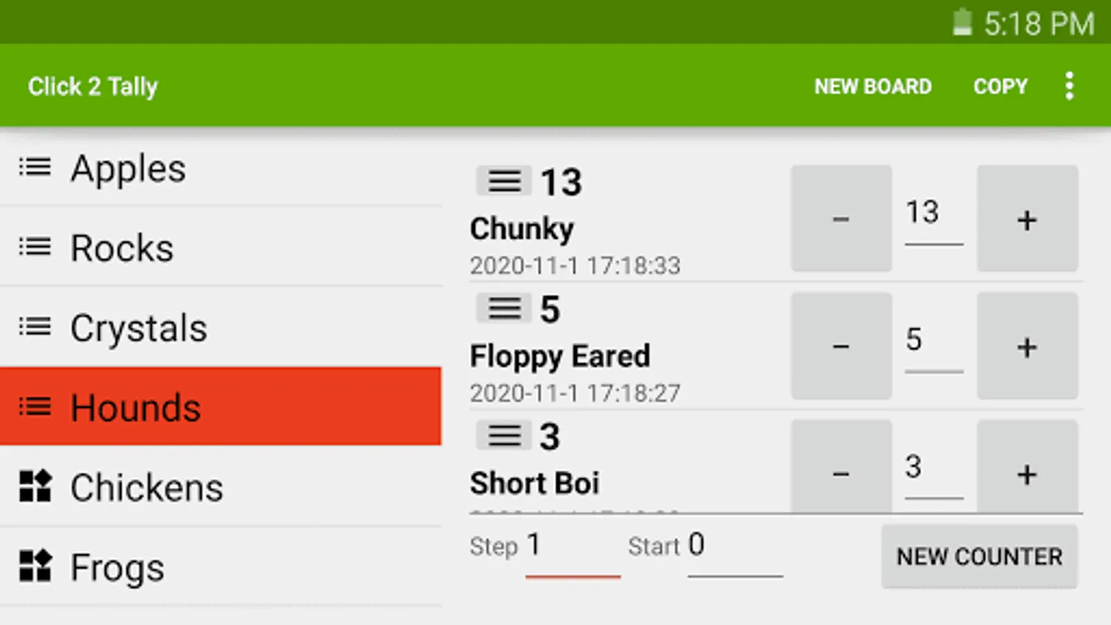 You can keep track of multiple counters at once and organize them into "Counting Boards". Choose how much to count by ("step") and what to start at. Negative and non-whole numbers are supported. Numbers can be very large. You can also convert numbers to tallies (integers 1-99,999). There are various settings. It has a home screen widget.