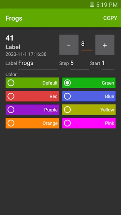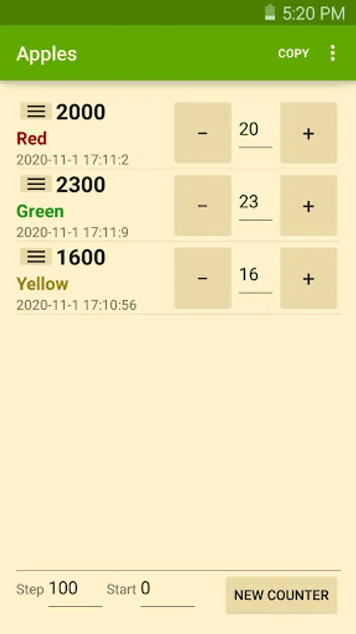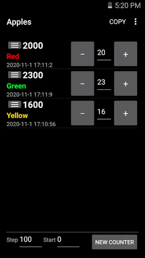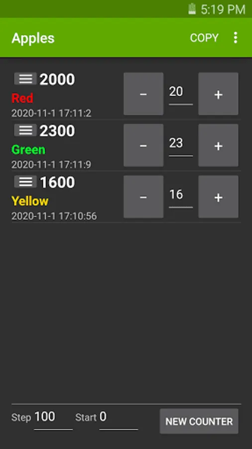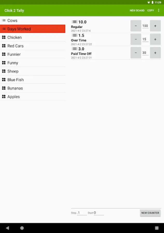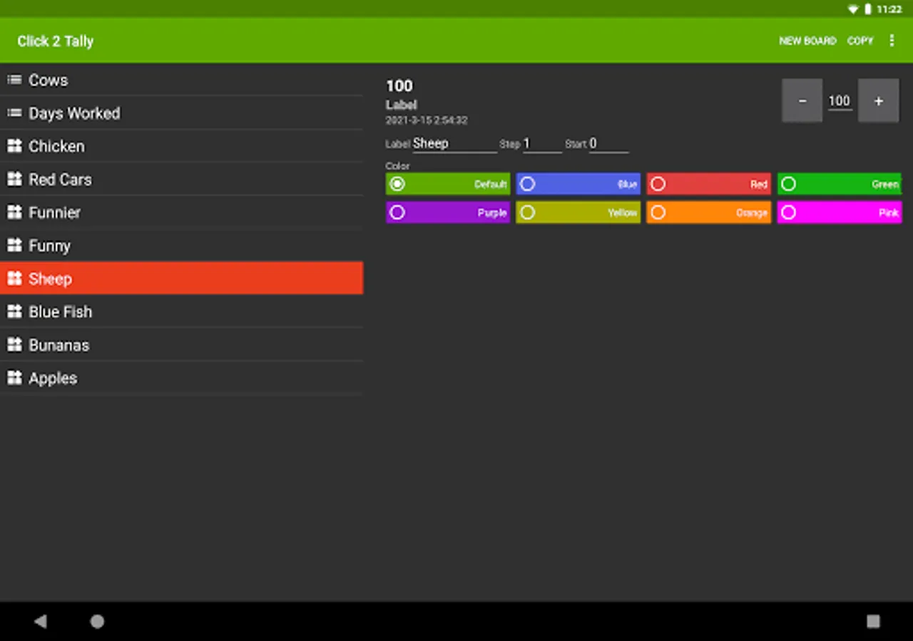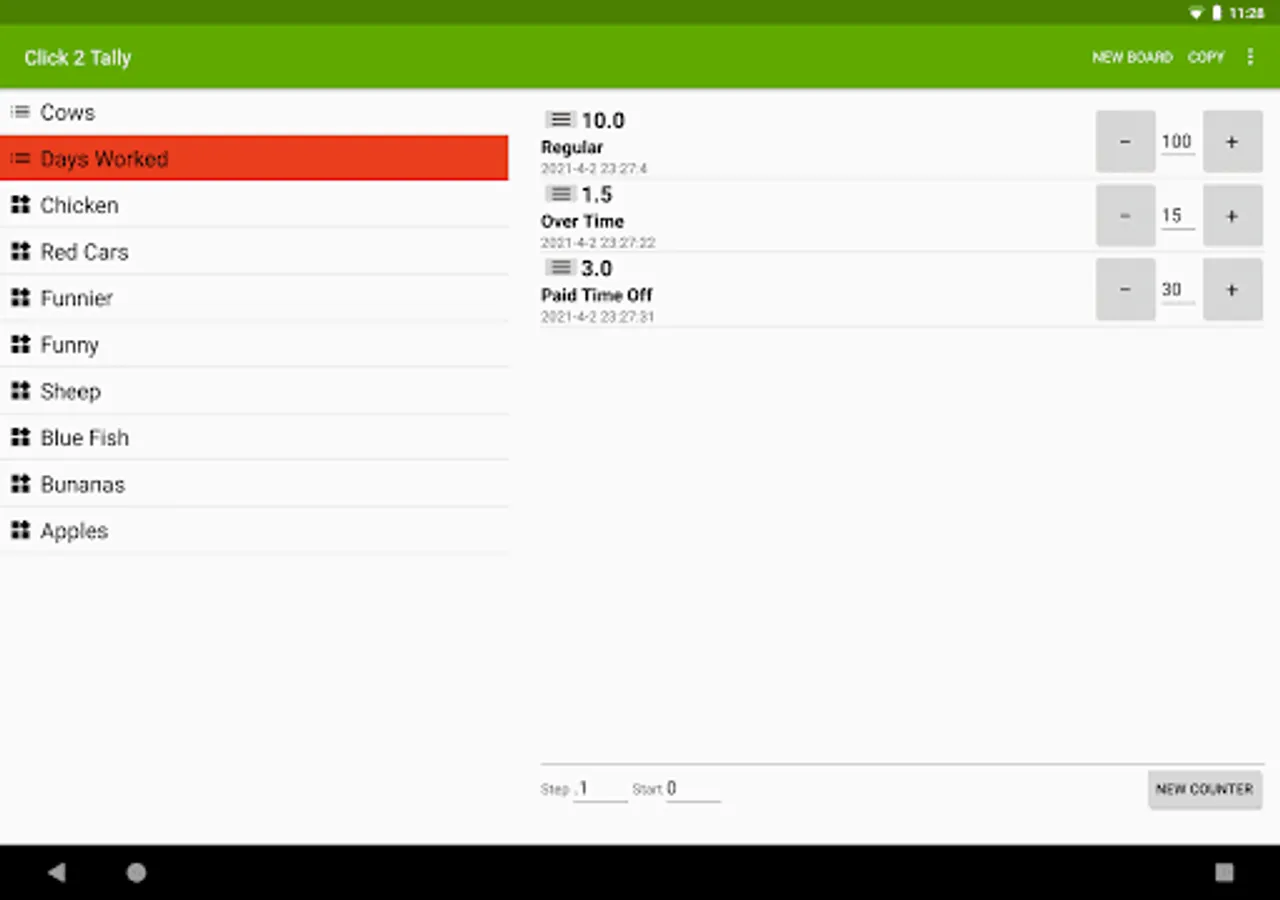 You can keep track of multiple counters at once and organize them into "Counting Boards". Choose how much to count by ("step") and what to start at. Negative and non-whole numbers are supported. Numbers can be very large. You can also convert numbers to tallies (integers 1-99,999). There are various settings. It has a home screen widget.