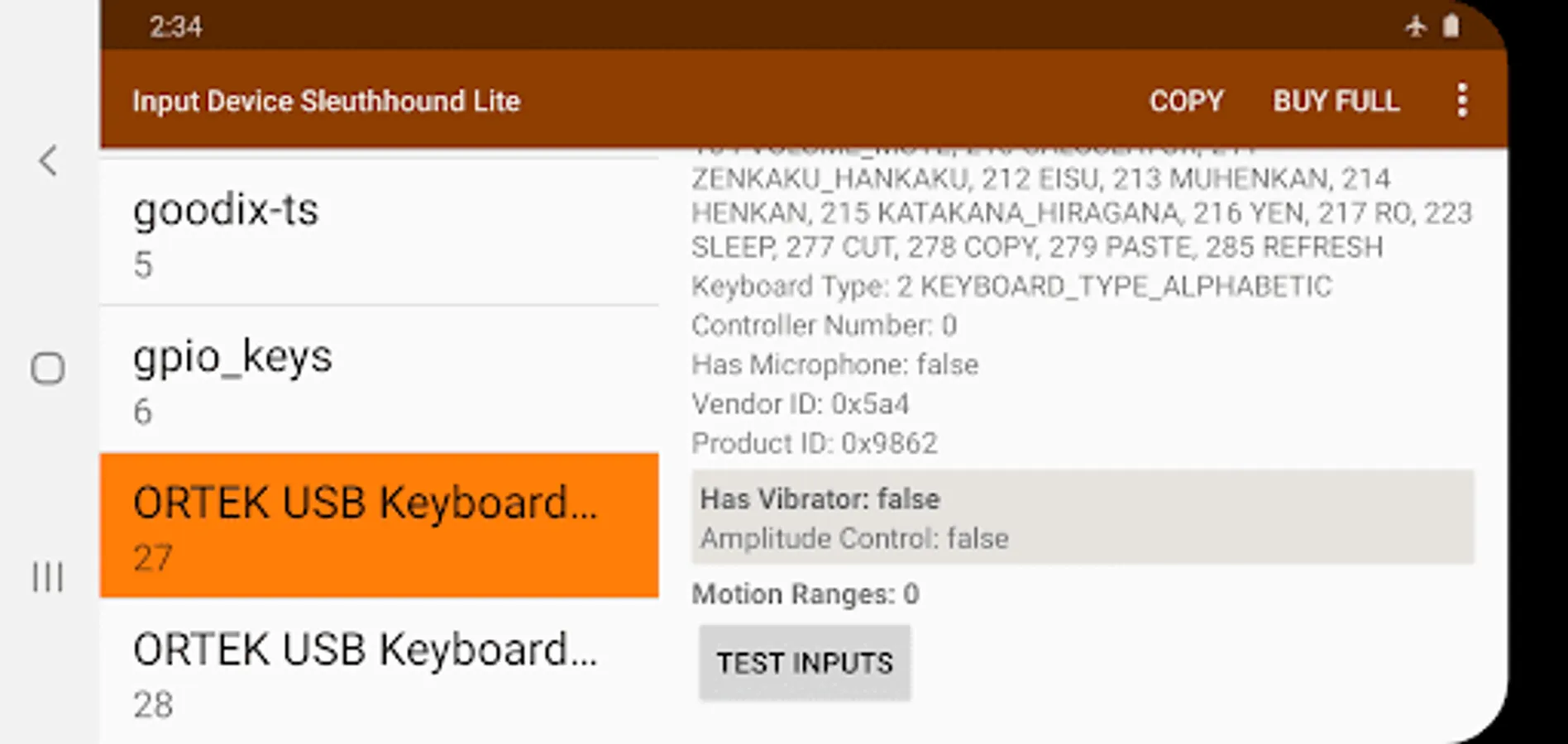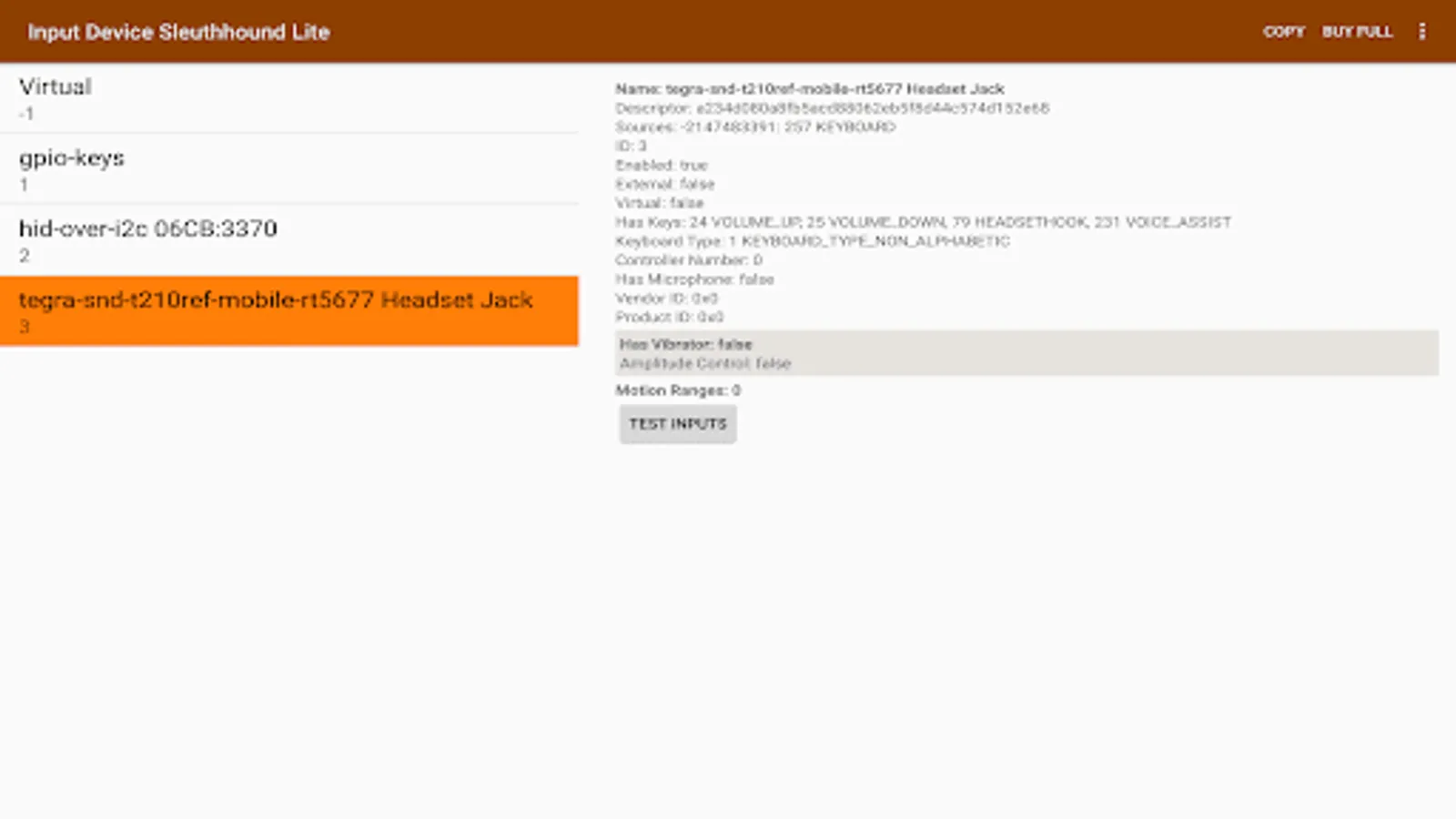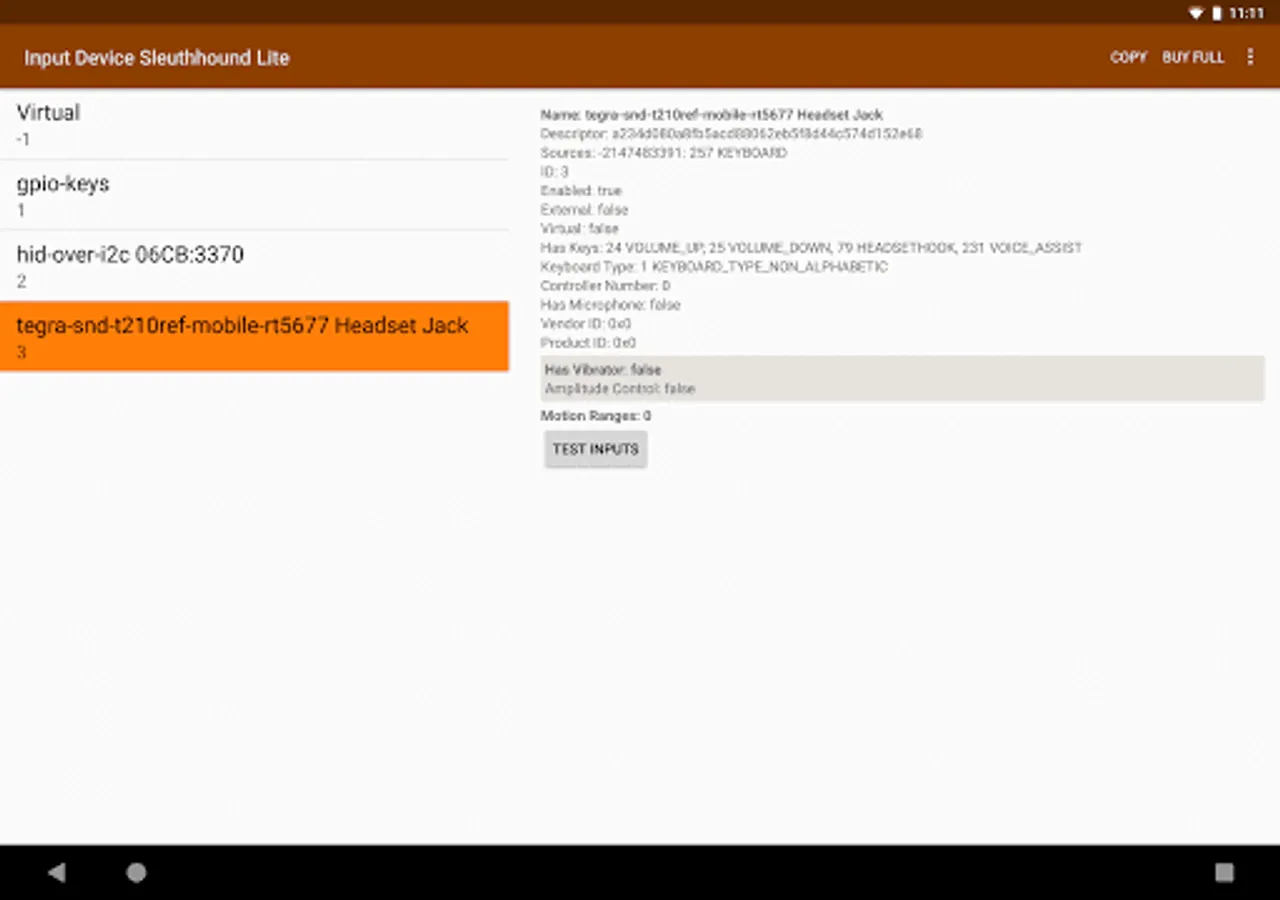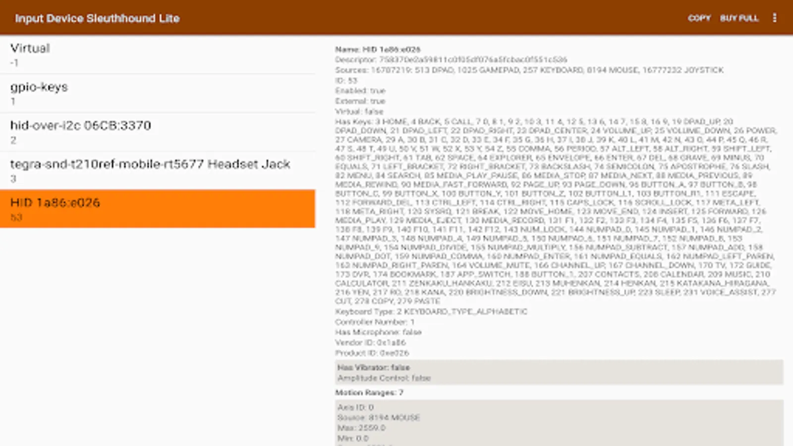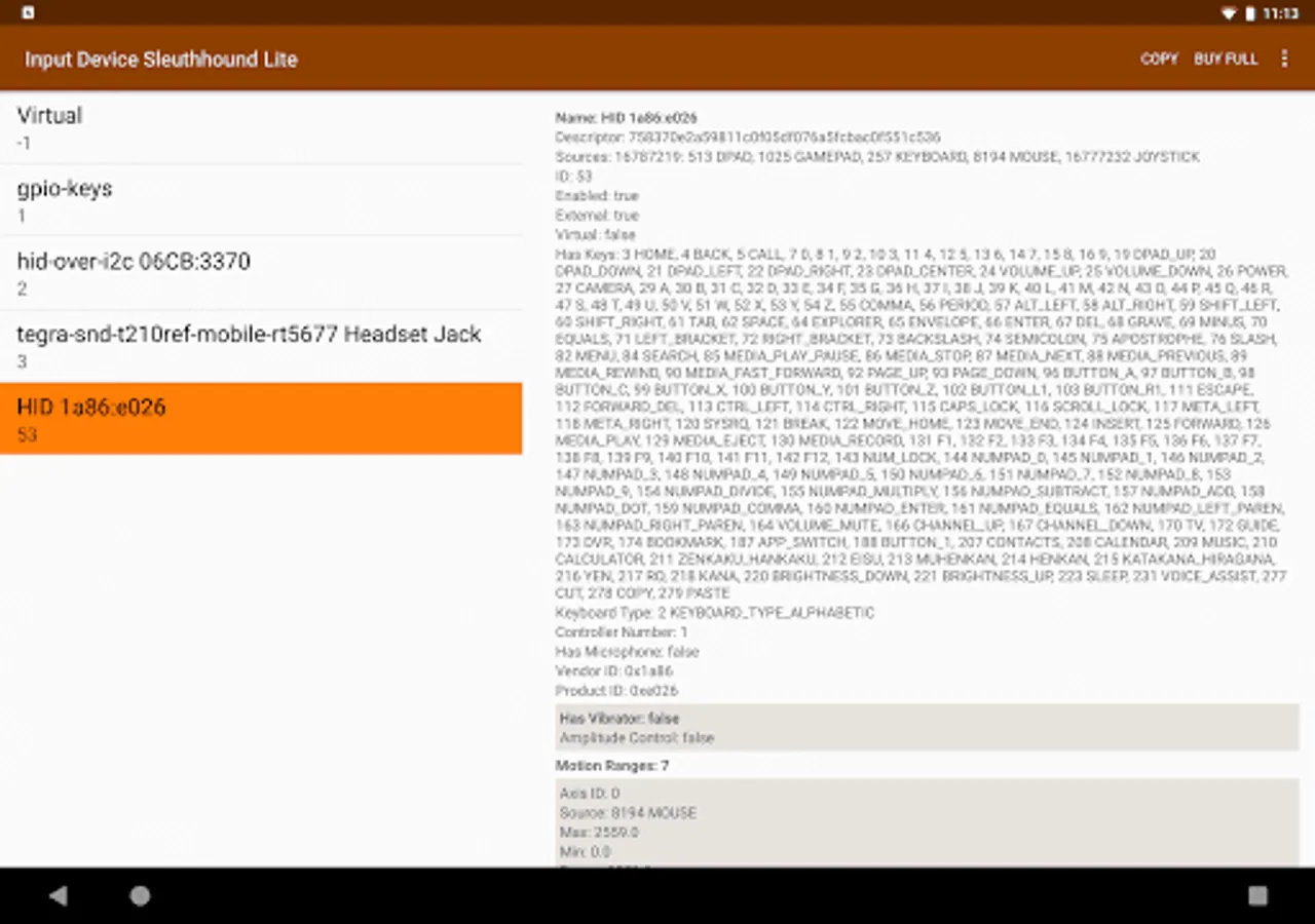 View information about input devices such as what keys it has, source values, motion ranges, vibrate support, and more. You can also watch input events coming from the devices. Viewing some information requires different Android API levels. Only input devices that are supported by your system are shown. The full version has more features.