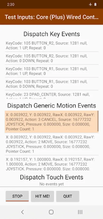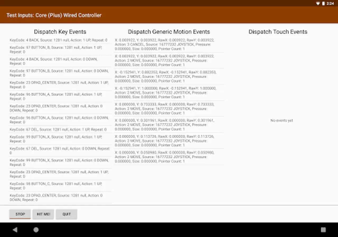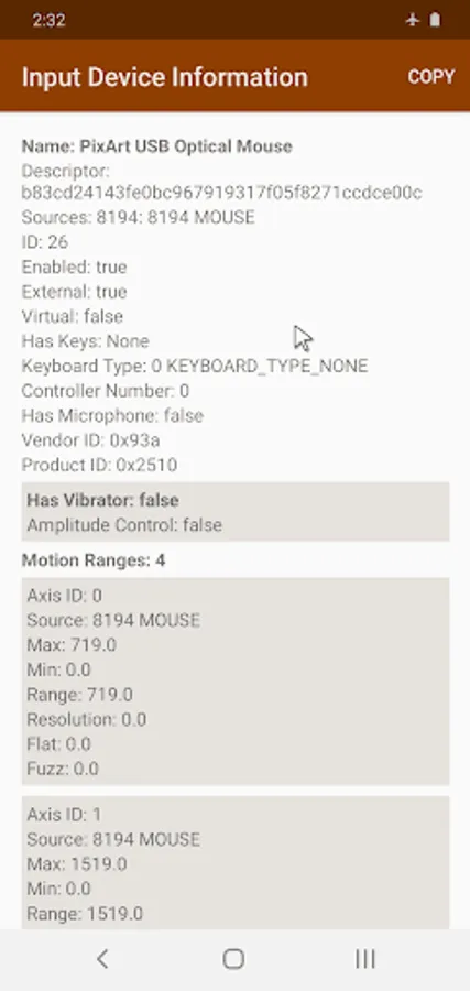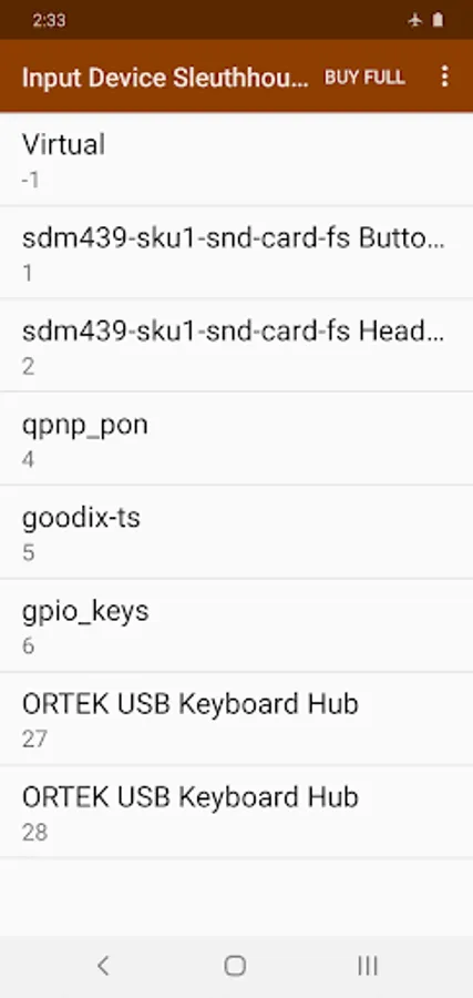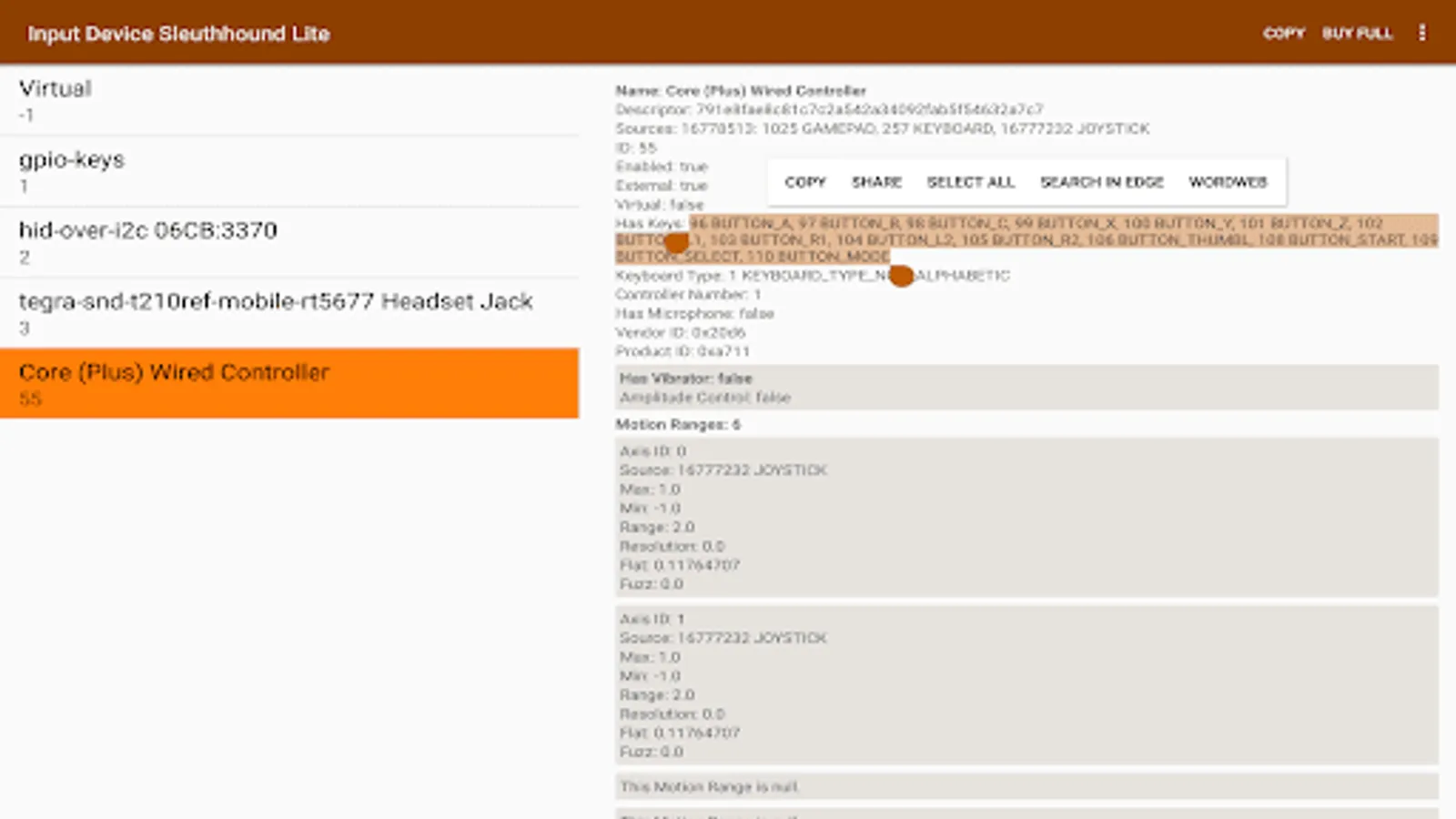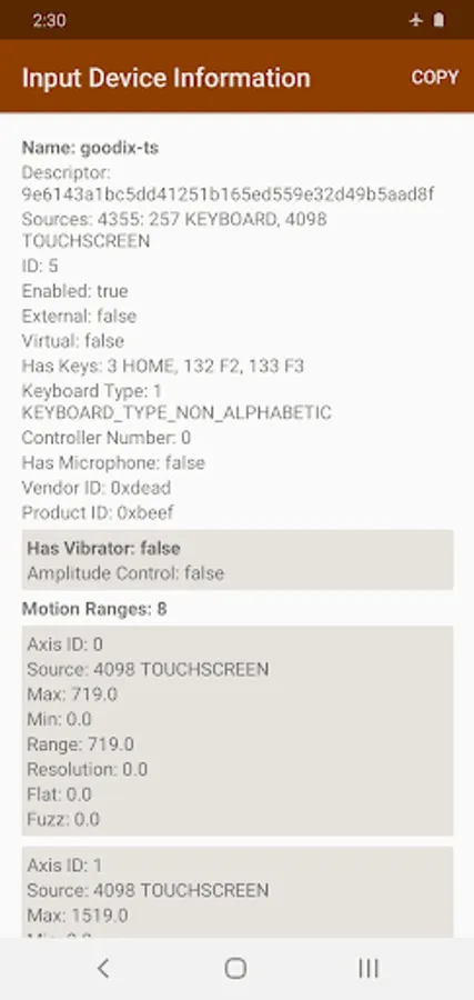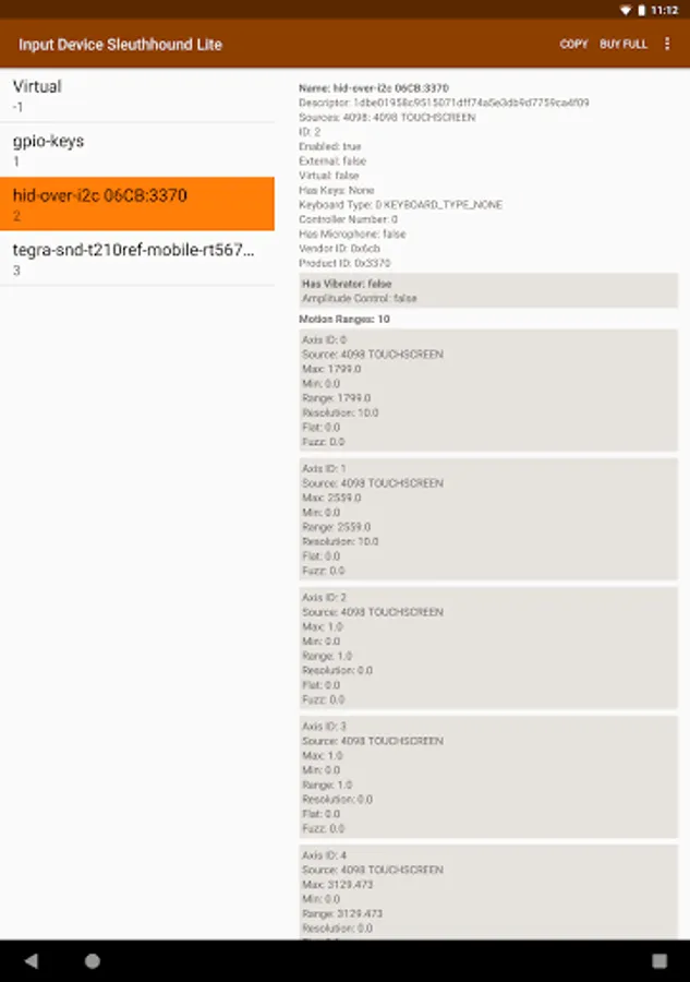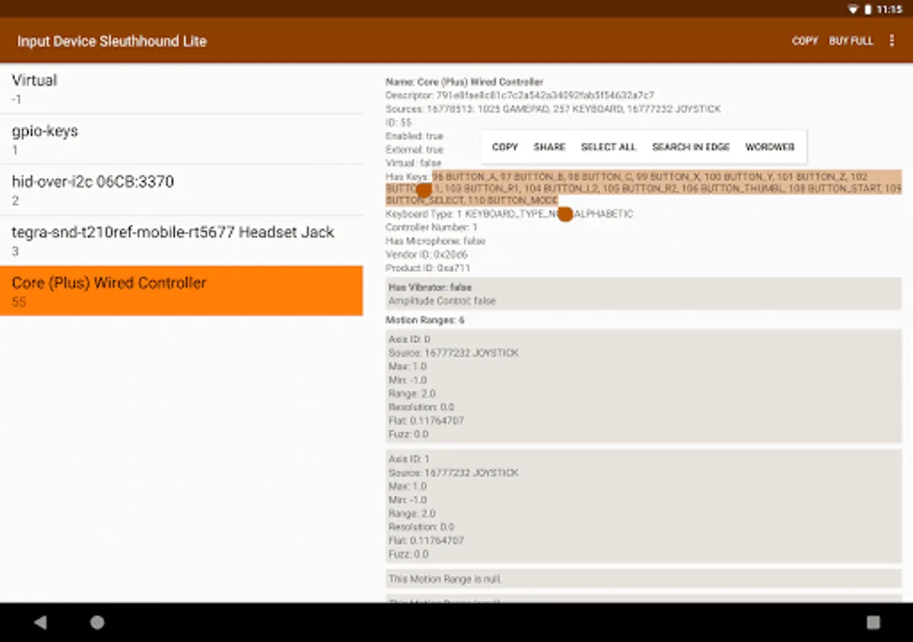 View information about input devices such as what keys it has, source values, motion ranges, vibrate support, and more. You can also watch input events coming from the devices. Viewing some information requires different Android API levels. Only input devices that are supported by your system are shown. The full version has more features.