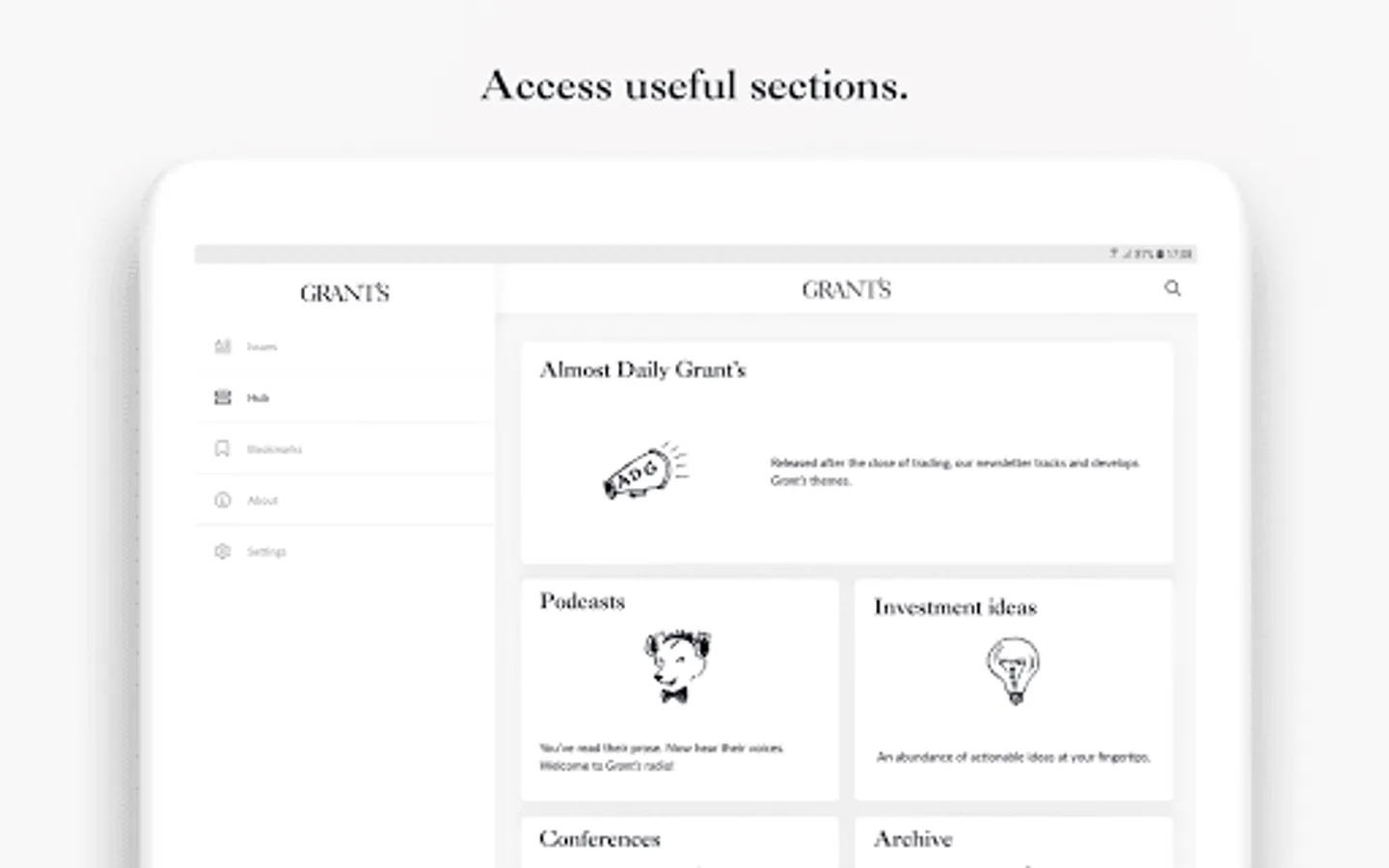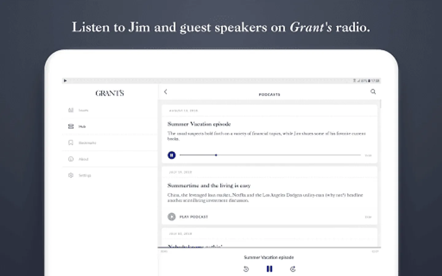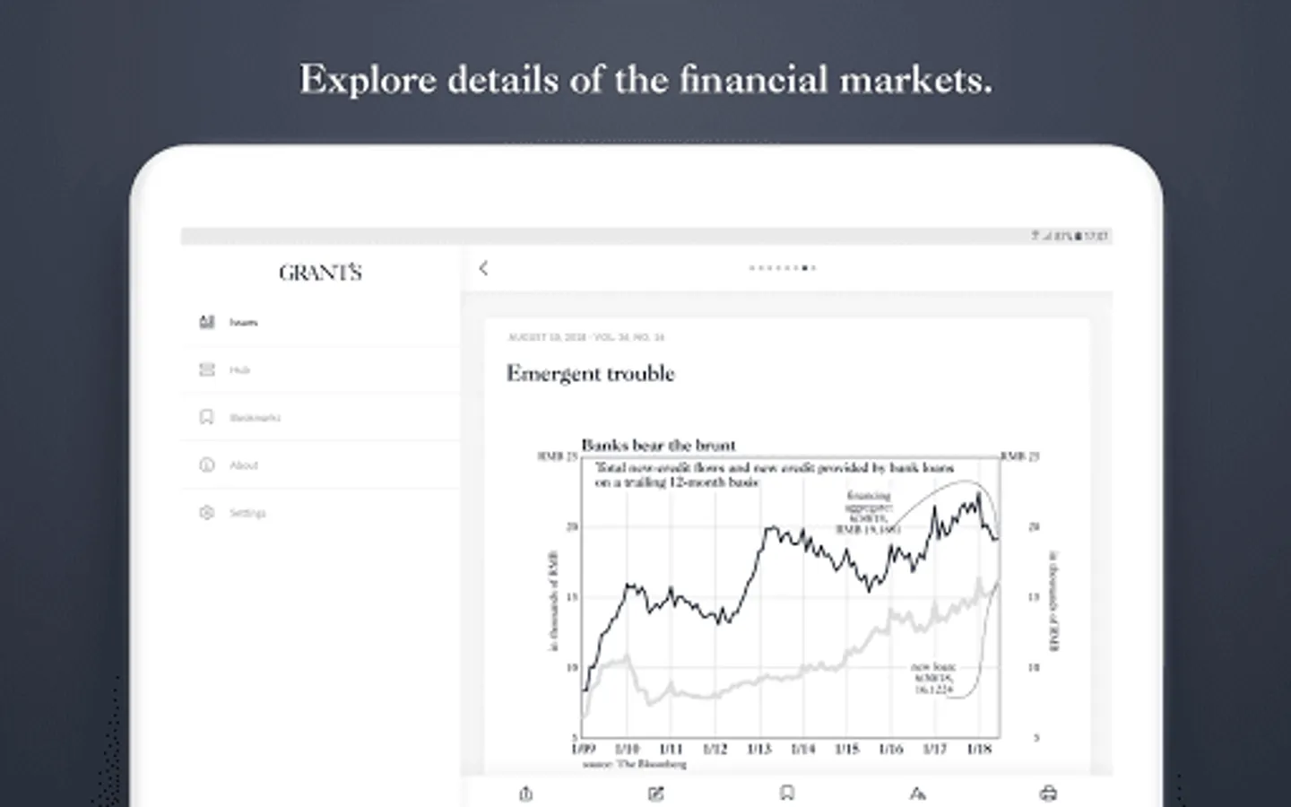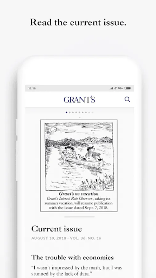 The Grant's app delivers each issue to you in a clean and easy-to-read format inspired by our print edition. Within the app, you can download and read any issue, anytime or anywhere you have an internet connection. And when you are offline, you can read any issue you have already downloaded. It's easy to take notes as well as bookmark articles or share them with friends. Beyond enjoying the stories in our flagship print edition, you can listen to our podcasts, stay up-to-date with our newsletter, "Almost Daily Grant's," search our 30-plus-year archive, and sign up for our conferences.