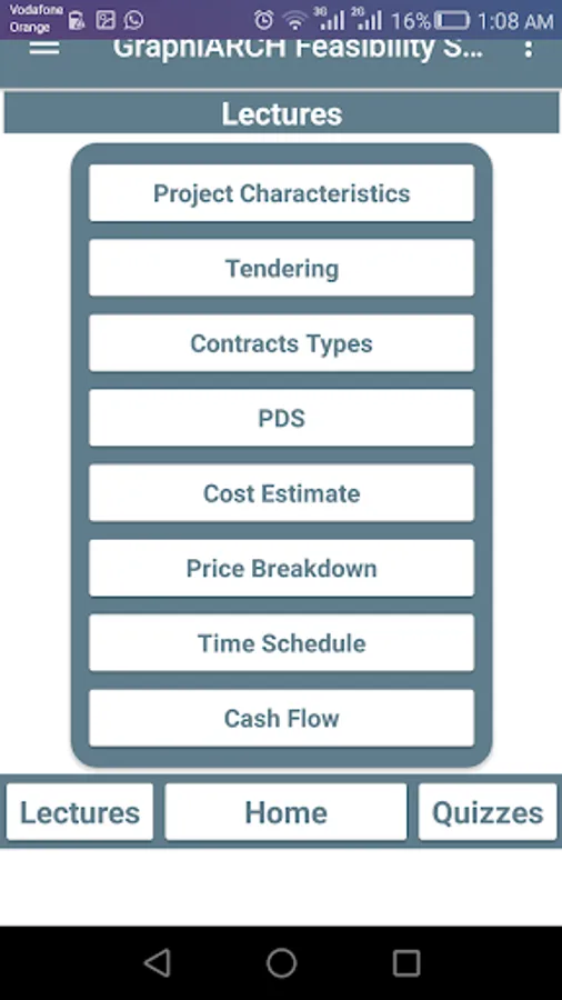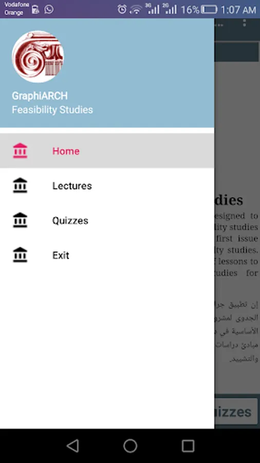 GrapiARCH feasibility studies is an application designed to serve who looking forward to start learning feasibility studies for construction projects. this application is the first issue which deals with the basic information of feasibility studies. this issue demonstrates this topic through group of lessons to cover the basic information in feasibility studies for architectural and construction students.
