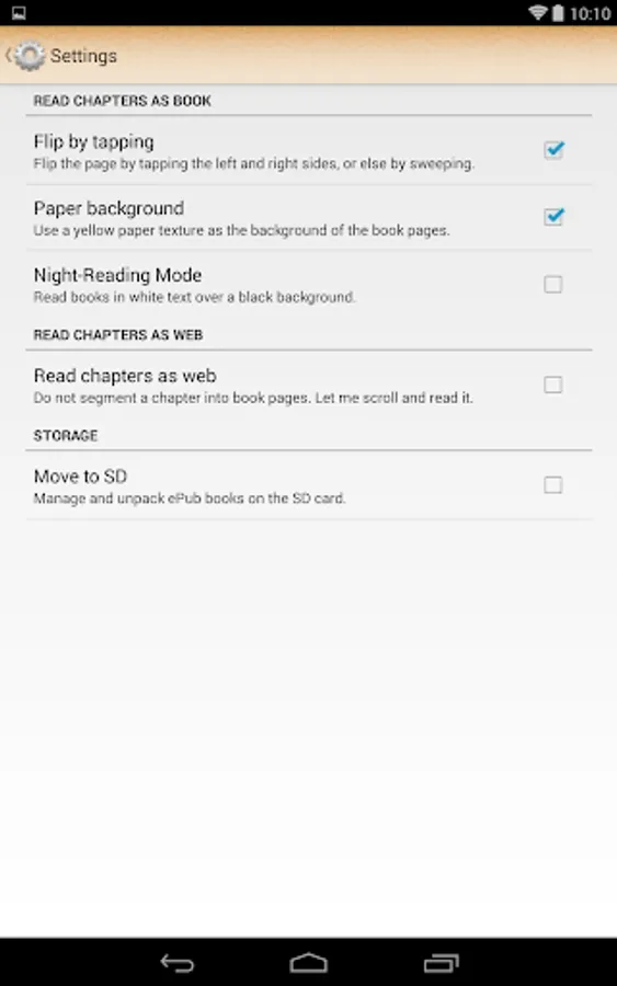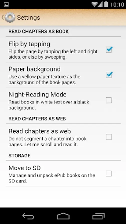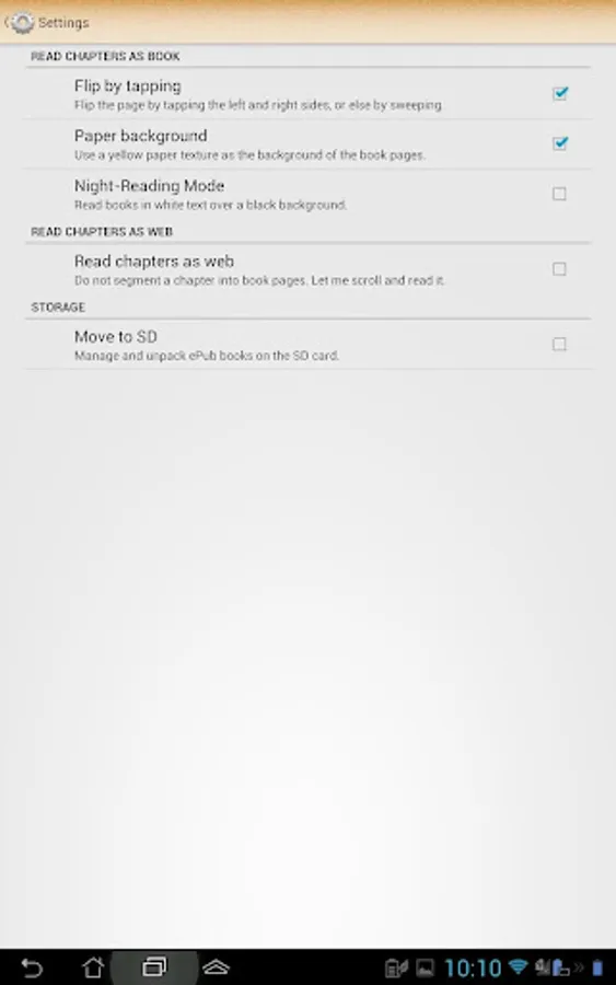 - Various operation modes: You can choose to read ePub files as web pages or as books. If you choose to read ePub books by page flipping, you can further choose to flip the pages by tapping or sweeping.
