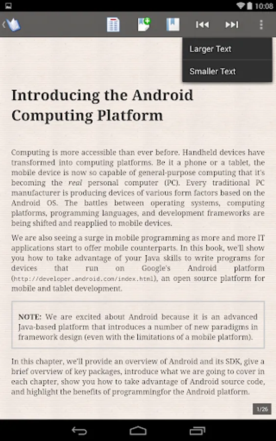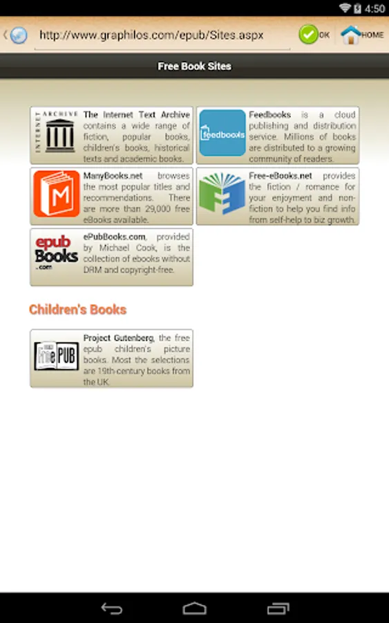 This freeware makes your Android phone become an ePub reader. It manages the .epub files you imported from SD card or downloaded from web sites, and let you read them by flipping as books, or by browsing as web pages. This software is not bound to any book store or online library. In addition, it provides you some web-site links to download DRM-free ePub files. This software performs a rapid, low power-consumption method to format a chapters into book pages. If you are familiar with web browsing, the software reserves the function that lets you read the chapters as raw web pages.