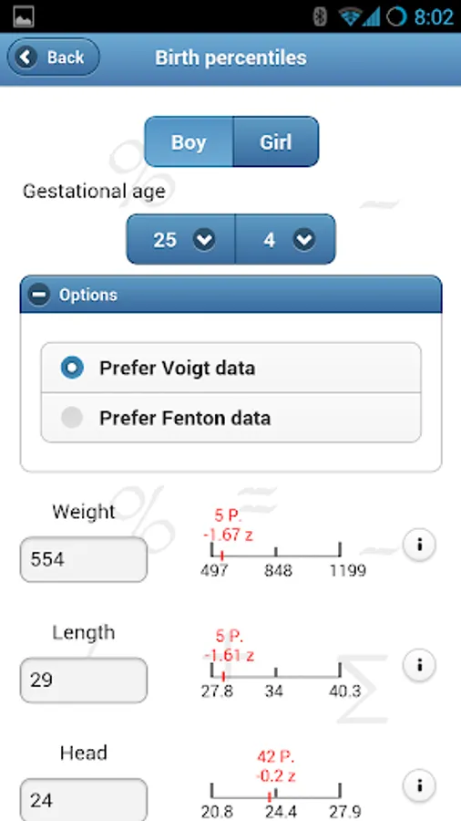 Birth percentiles: Calculation for term and preterm newborns according to: Voigt et al. 2006; Fenton TR, Kim JH. A systematic review and meta-analysis to revise the Fenton growth chart for preterm infants. BMC Pediatr. 2013; 13:59 biomedcentral.com/1471-2431/13/59