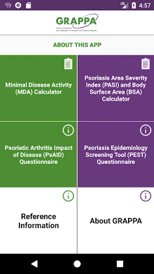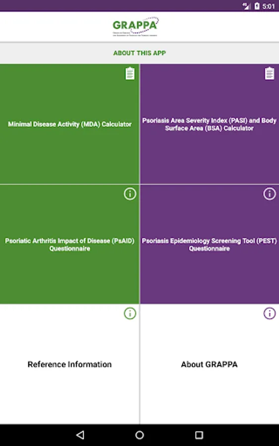 This app from GRAPPA (Group for Research and Assessment of Psoriasis and Psoriatic Arthritis) is designed to support the assessment of patients with psoriatic arthritis and psoriasis. It allows users to calculate a patient’s MDA and assess skin disease (using either PASI or BSA) through specially designed calculators. The app also includes PsAID, PEST and HAQ questionnaires which can be completed directly by patients in a range of languages and a selection of slides from the GRAPPA resources. Visit http://www.grappanetwork.org/ to find out more about GRAPPA.
