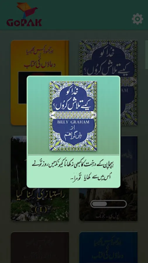 GOPAK is abbreviation of "Gospel Packet. A packet filled with good news. The app is a book reader and comes free with 7 books in Urdu language. The user can read the books in their own free time. User can download more free books on different subject. App has a contact us form which allow user to contact us if he/she has more questions about on the subjects in the books. The books are focused on answering basic questions about Christian faith and how to receive new faith in Jesus. The app is develop with partnership of MIK (Christian books publishers) Pakistan